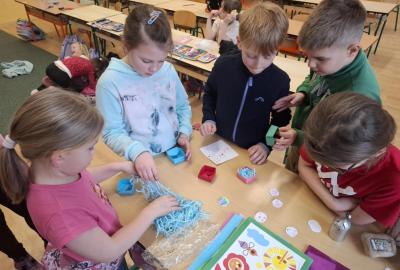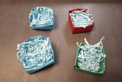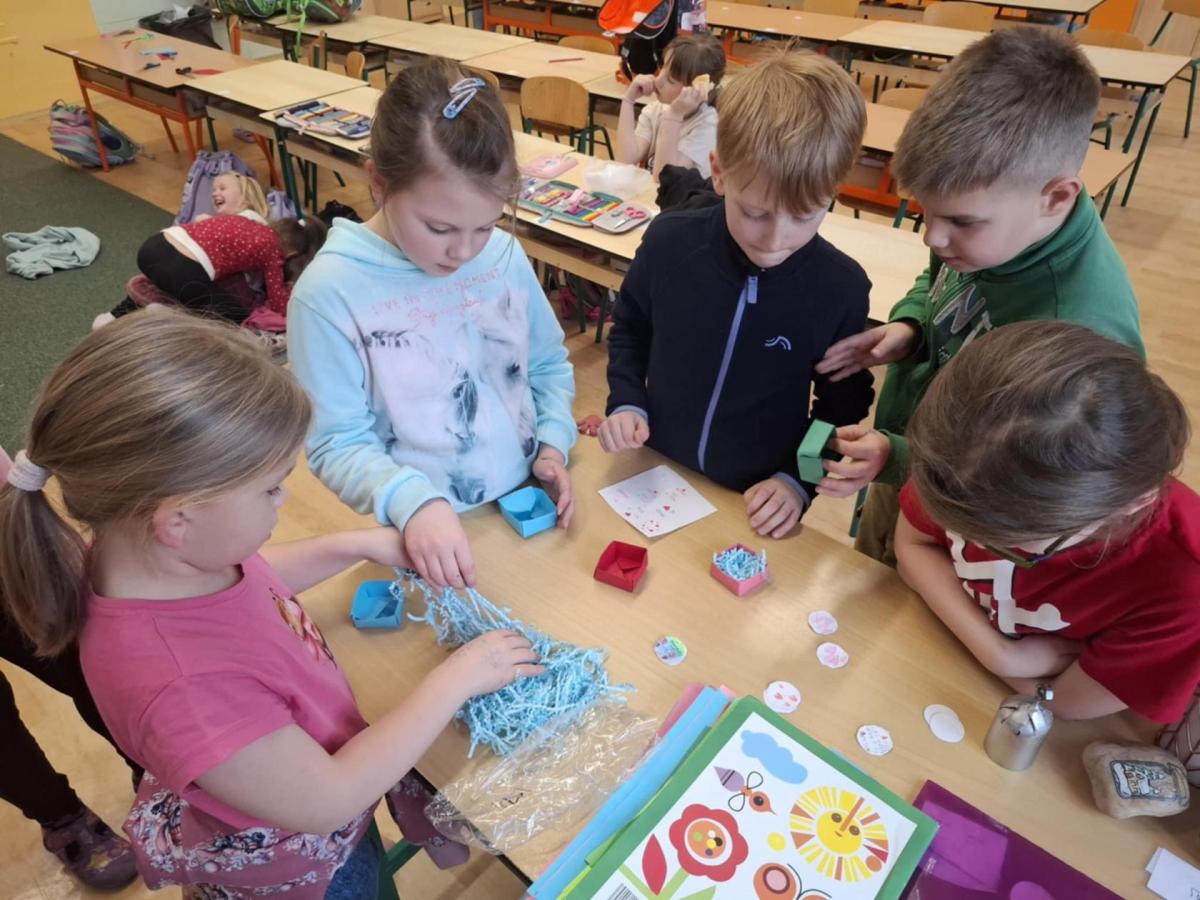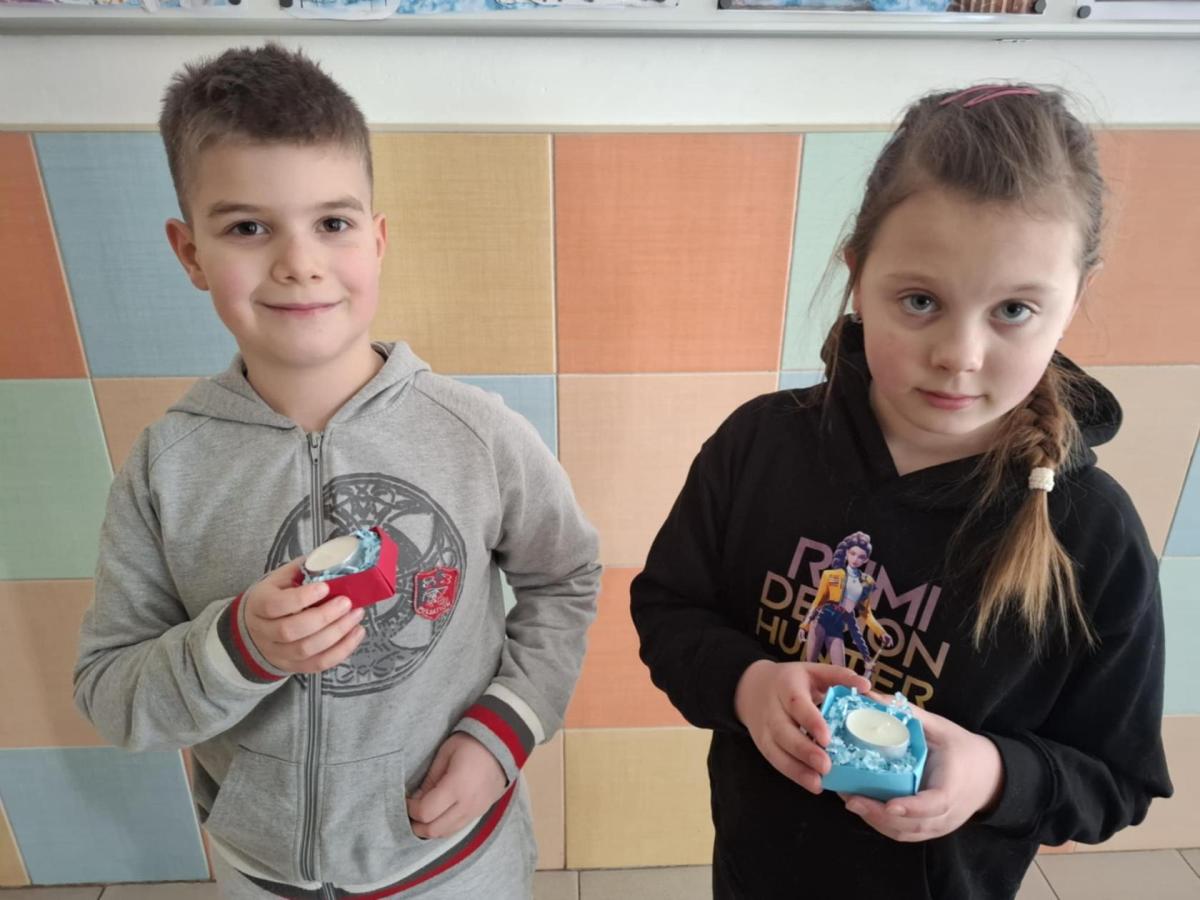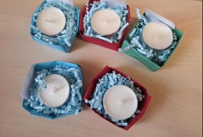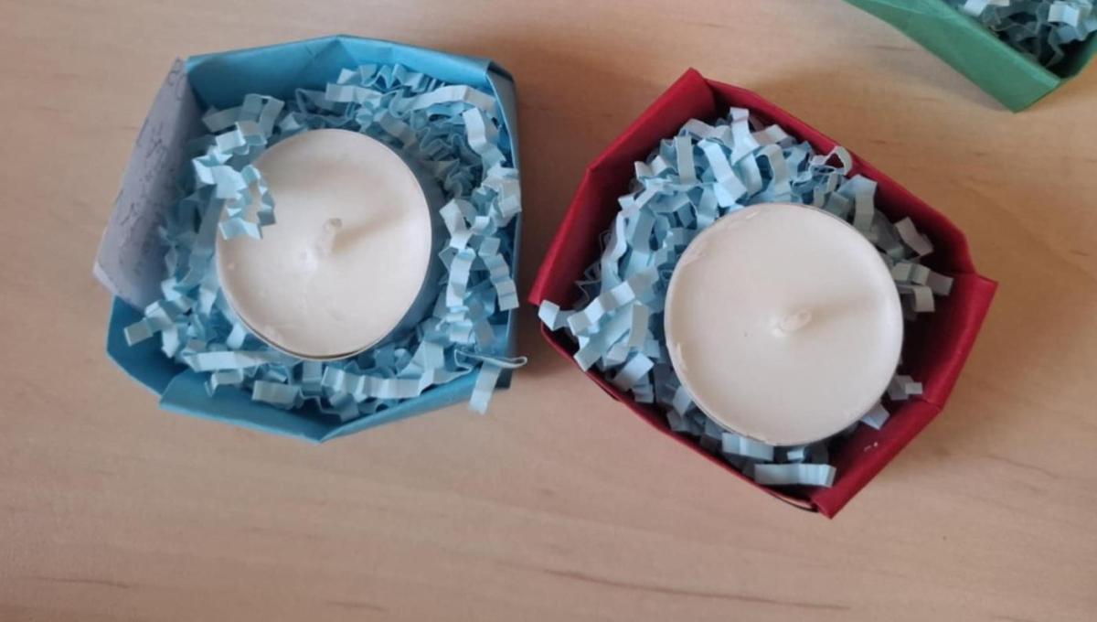 Kromě vzkazů si ke svíčkám děti také samy z papíru poskládaly krabičku, do které poté svíčku uložily a ve které jí doma předají jako dáreček.