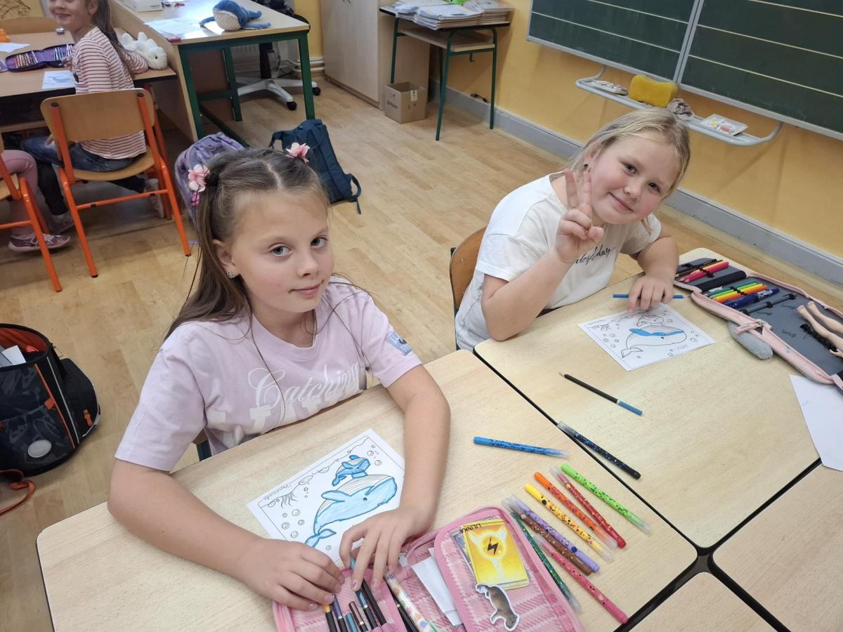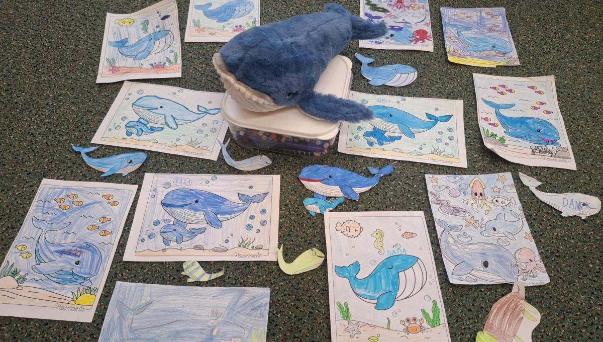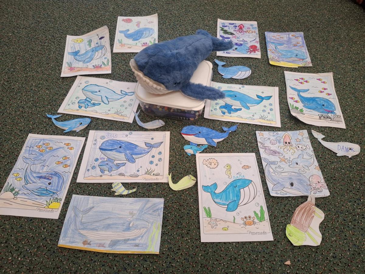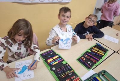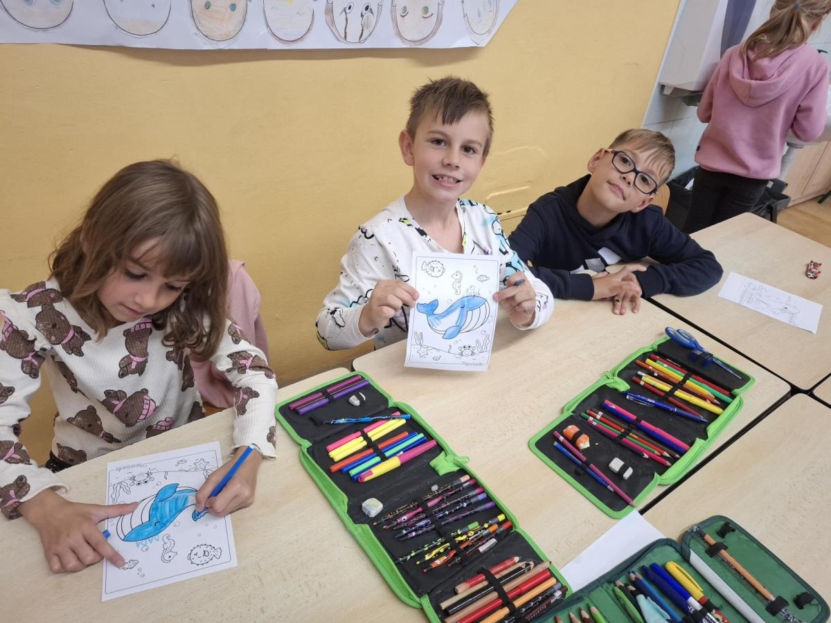 A tak děti z modrého oddělení vytvořily Ňufíkovi nové přátele. Z ponurého odpoledne se stalo veselé tvoření plné smíchu a barev a během chvilky jsme ve třídě měli celou mořskou partu velryb.