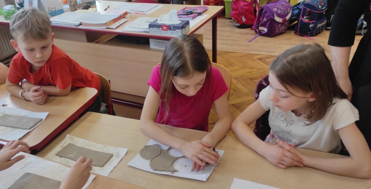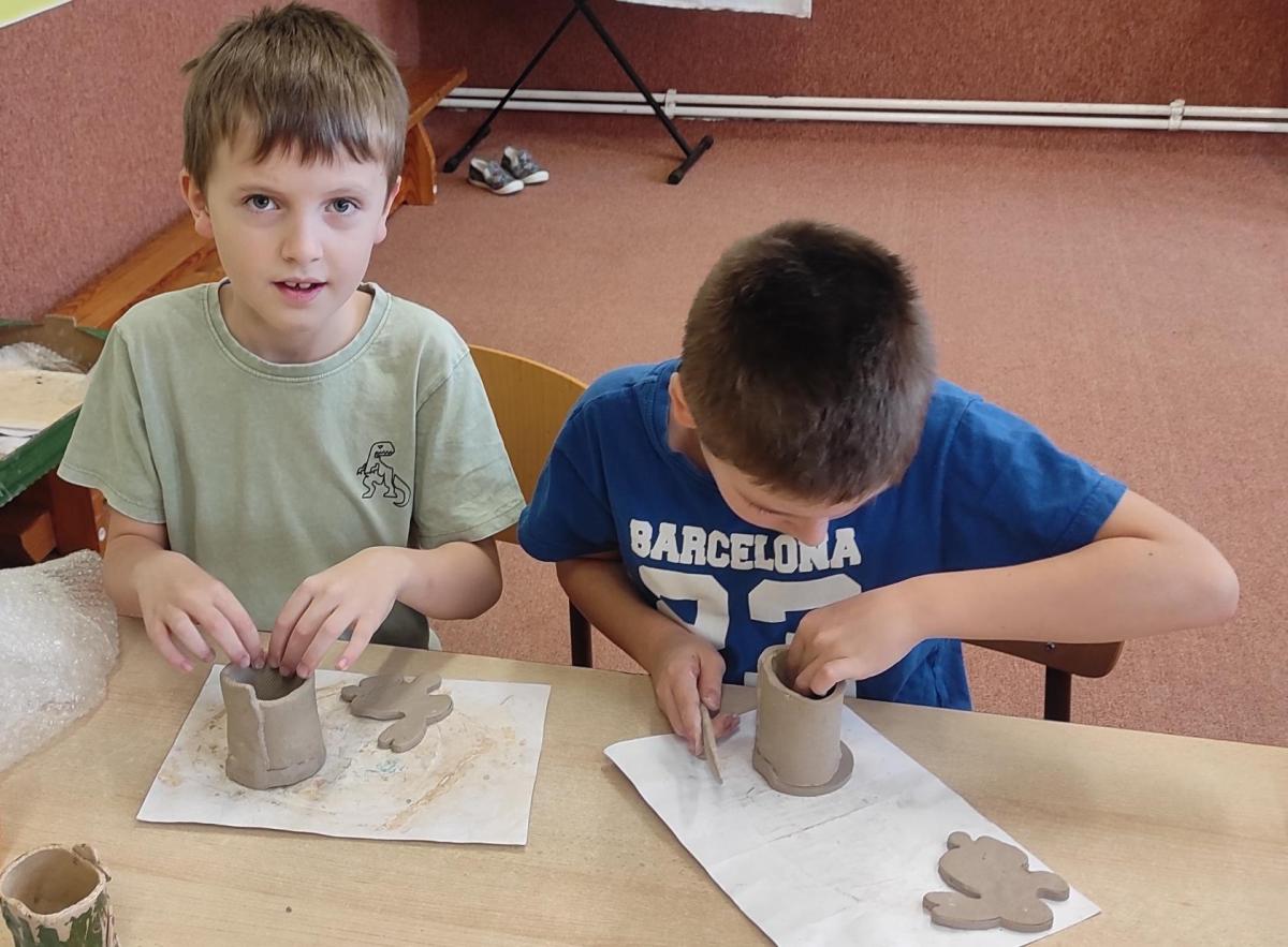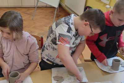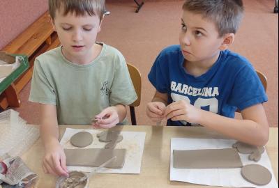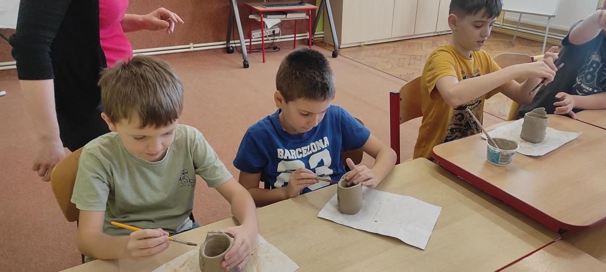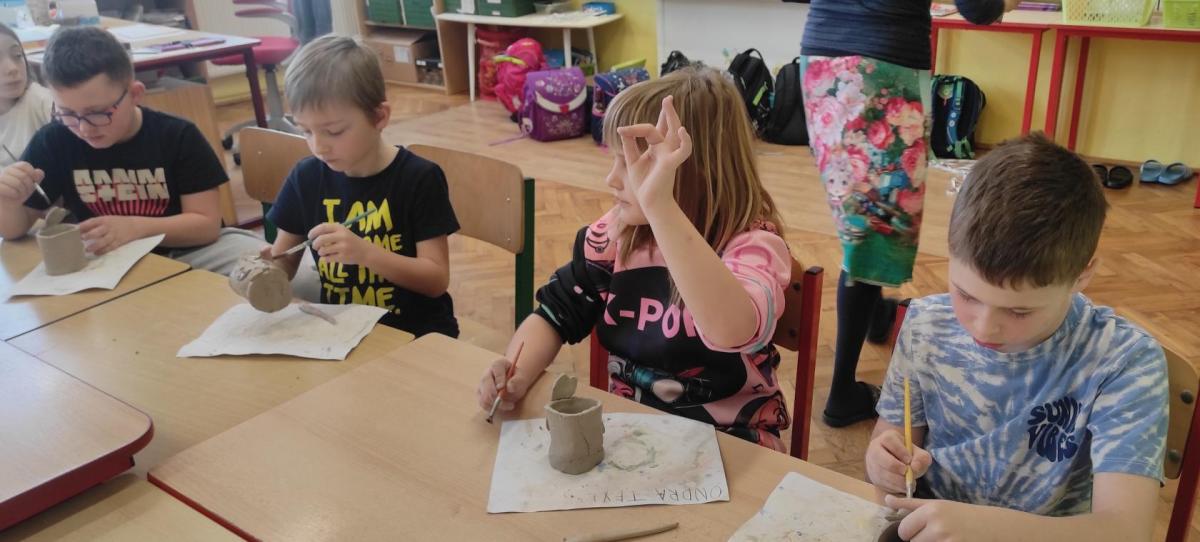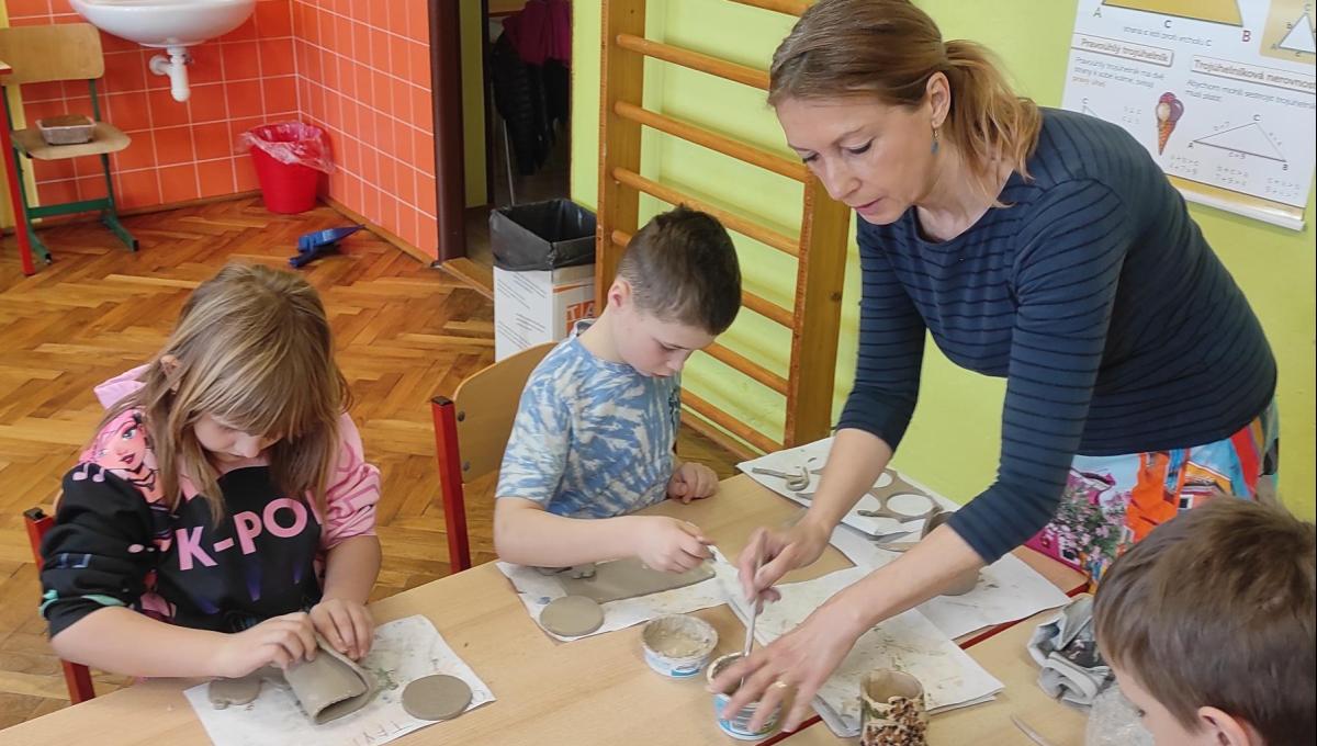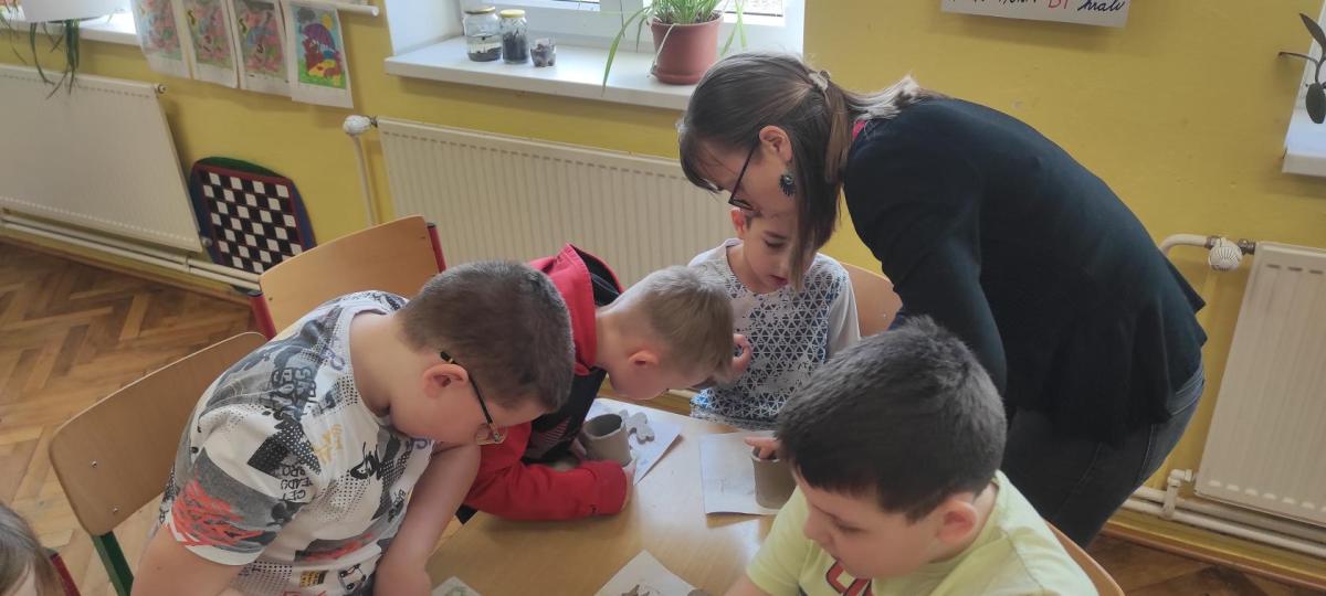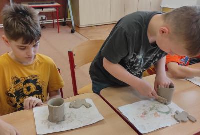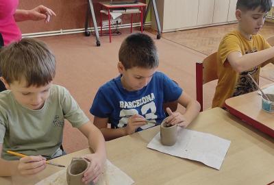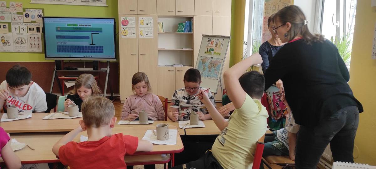 Páteční čas nám zpestřila paní Karla Rejmanová z keramického ateliéru Radost. S dětmi vytvořila vázičku k blížícím se Velikonocům.