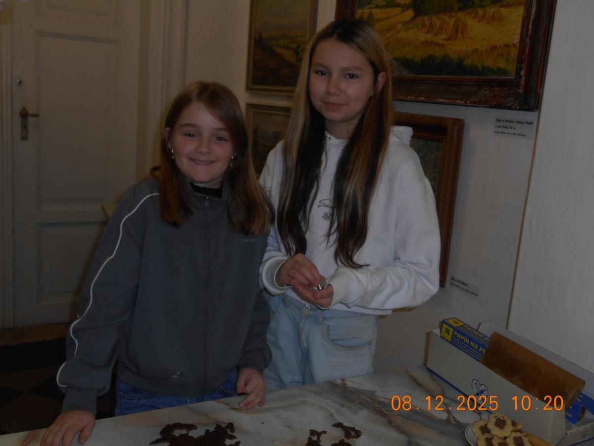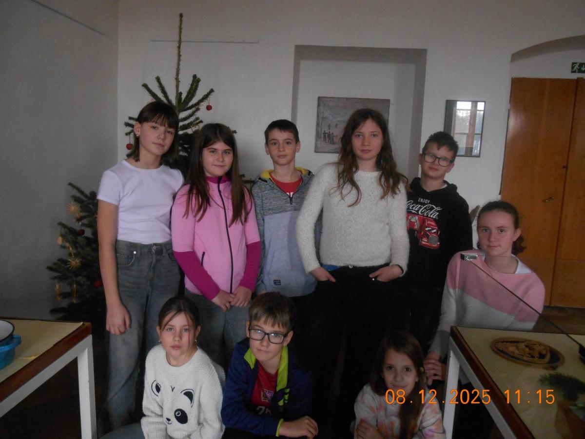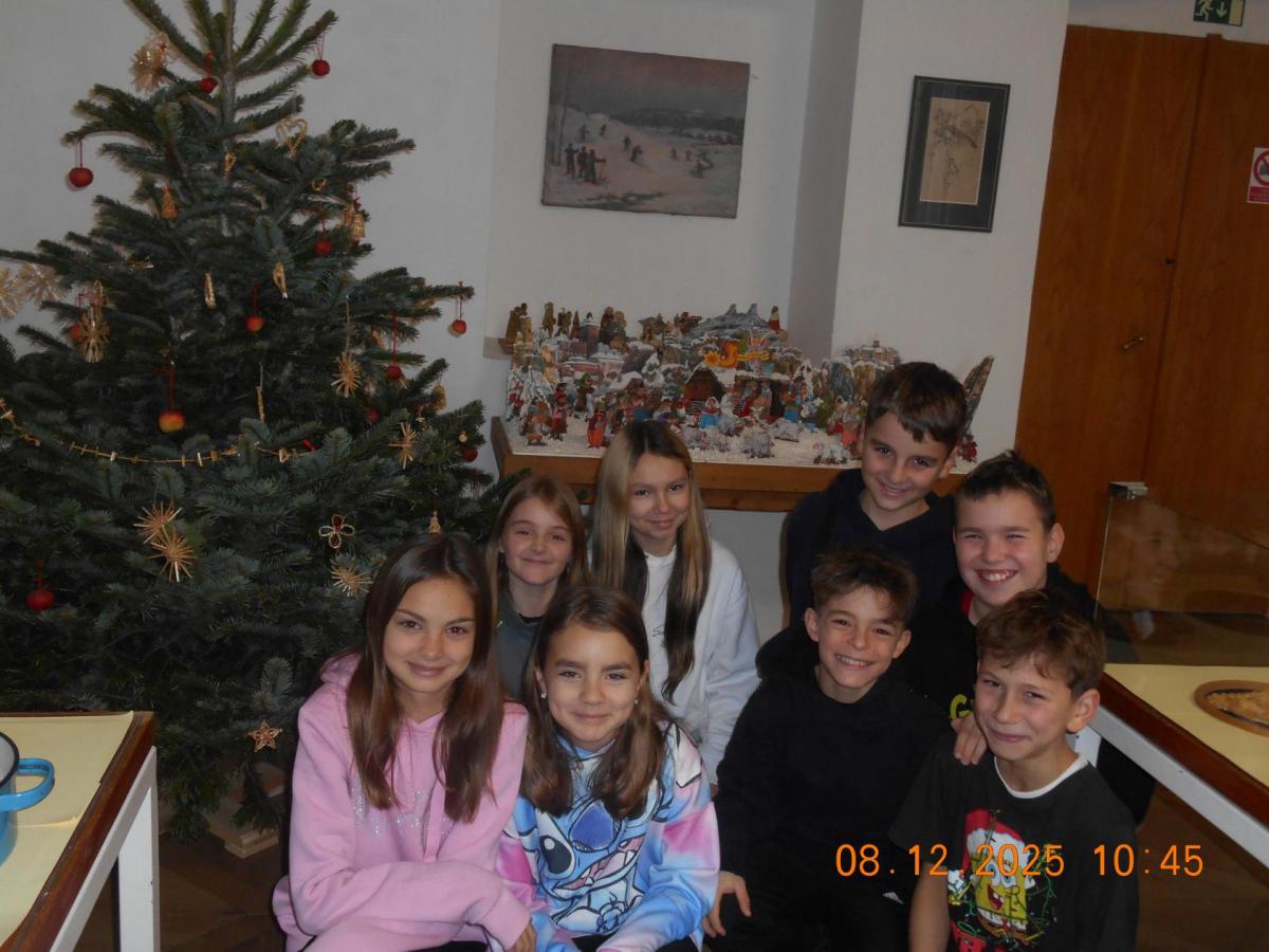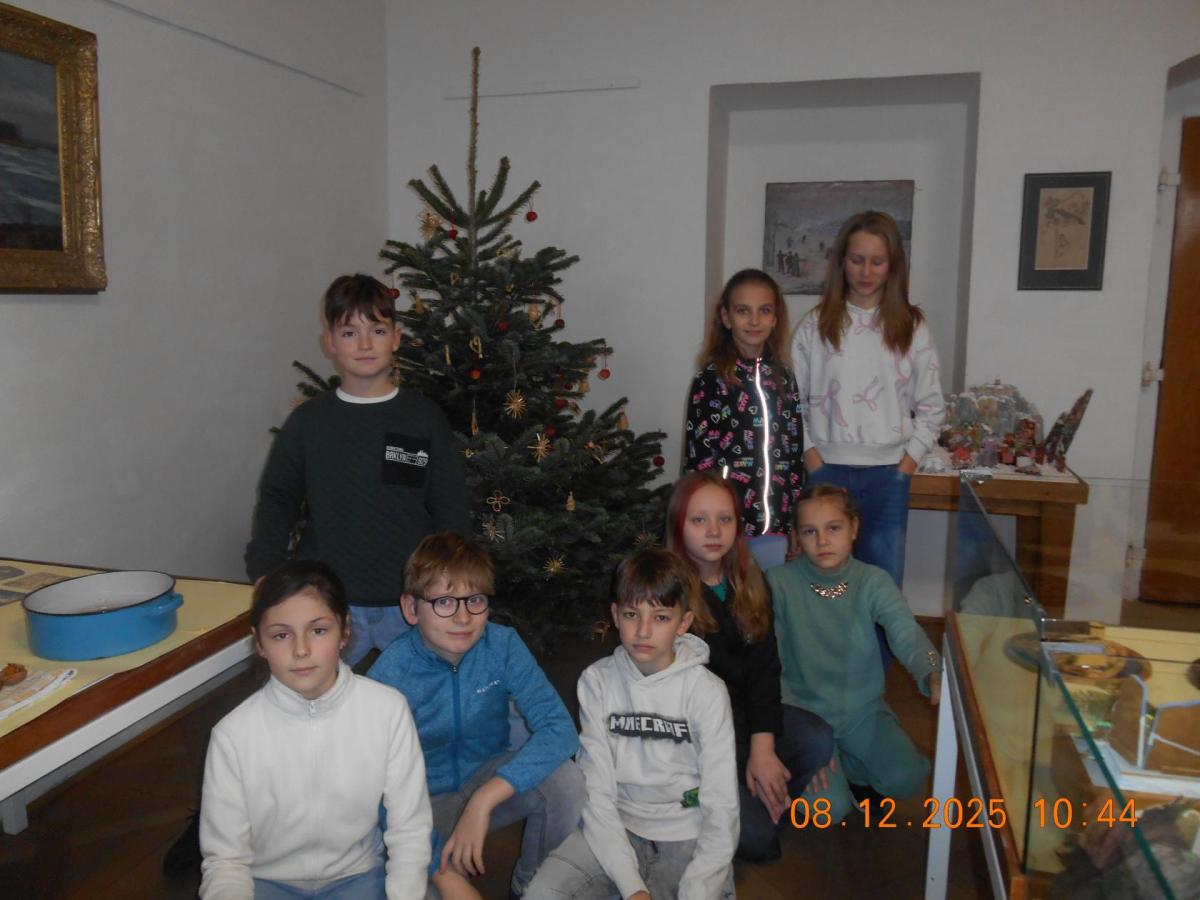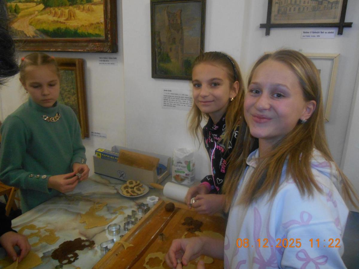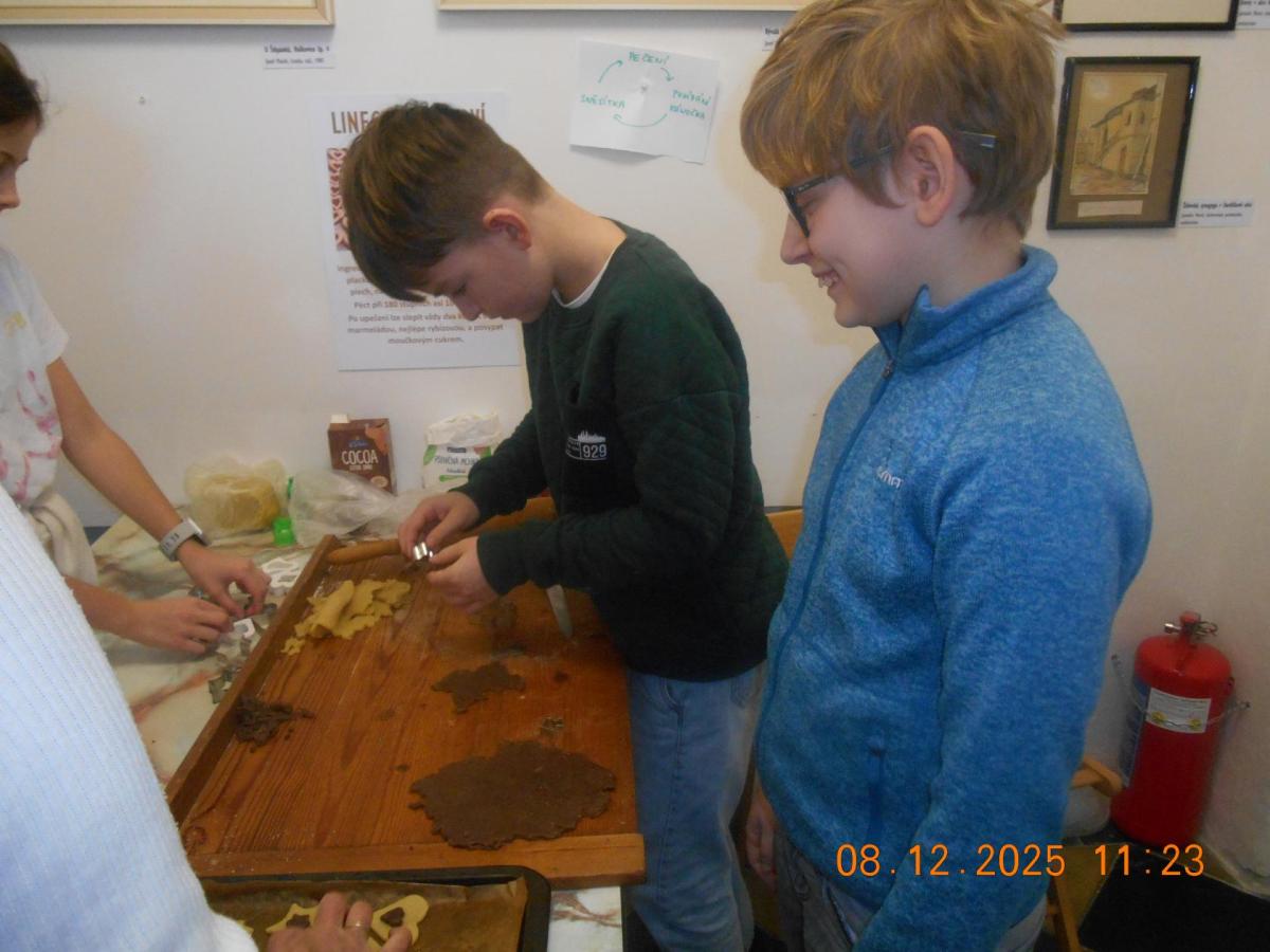 Už ve škole jsme se rozdělili do tří skupin. V muzeu se nás ujaly paní učitelky, ktere se nám na jednotlivých stanovištích velmi trpělivě a ochotně věnovaly. V improvizované " kuchyňce " jsme pekli linecké cukroví. Všichni jsme pečlivě vykrajovali různé tvary cukrovíček. Prostory muzea byly provoněny omamnou vůní a my jsme se těšili, až bude dopečeno. Po vychladnutí jsme konečně mohli naše sladkosti ochutnat. Také jsme se naučili zabalit kostku cukru do hedvábného papíru tak, že vypadala jako opravdový čokoládový bonbon na stromeček. Další místo bylo pro změnu provoněno nádhernou vůní vánočního čaje. Na stolku na nás čekala vánočka. My jsme se způsobně usadili na pohovku a do křesílek, upíjeli jsme čaj a povídali si o tom, jak lidé dříve trávili Vánoce. Celá místnost byla plná krásných vánočních betlémů vyrobených z různých materiálů. V údivu jsme žasli nad zručností a umem našich předků. Také jsme se seznámili s postavou Jiřího Ignáce Linky z Bakova, jehož vánoční hudba navodila nádhernou vánoční atmosféru. V poslední místnosti byly kromě pracovních stolů i postavy ve skutečné velikosti, které jsou spojené s adventem. Každý z nás si vyrobil vánoční " sněžítko " a vyzkoušeli jsme si i některé vánoční zvyky. Advent v muzeu jsme si moc užili a děkujeme všem paním učitelkám, které tento čas trávily s námi. KRÁSNÉ VÁNOCE VŠEM