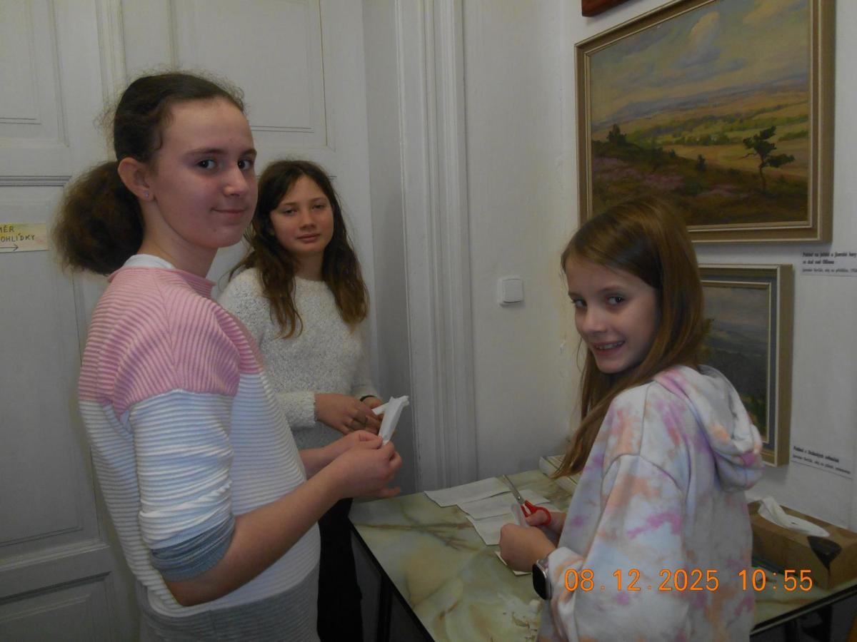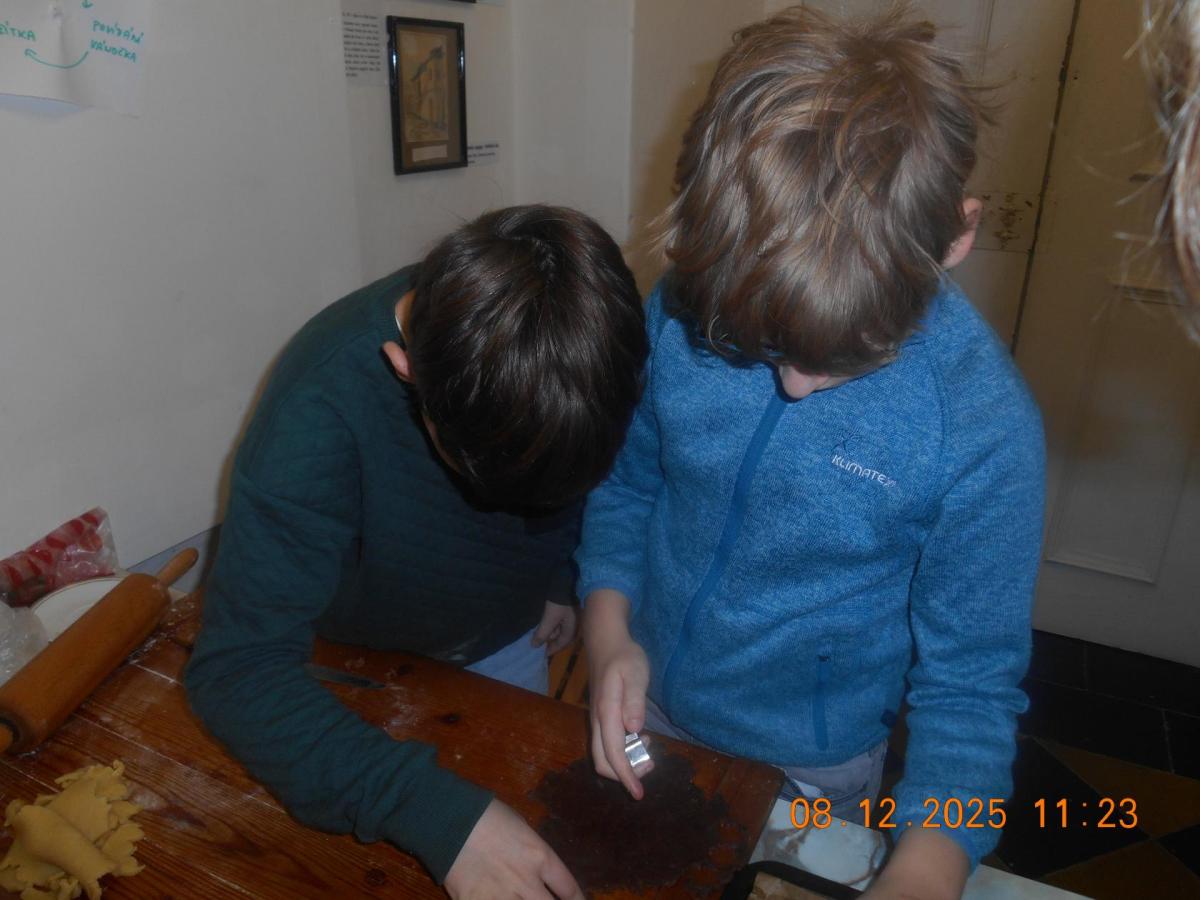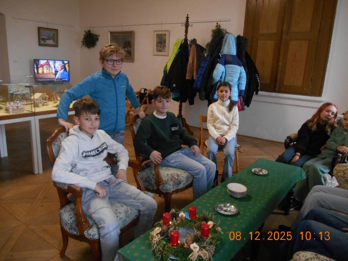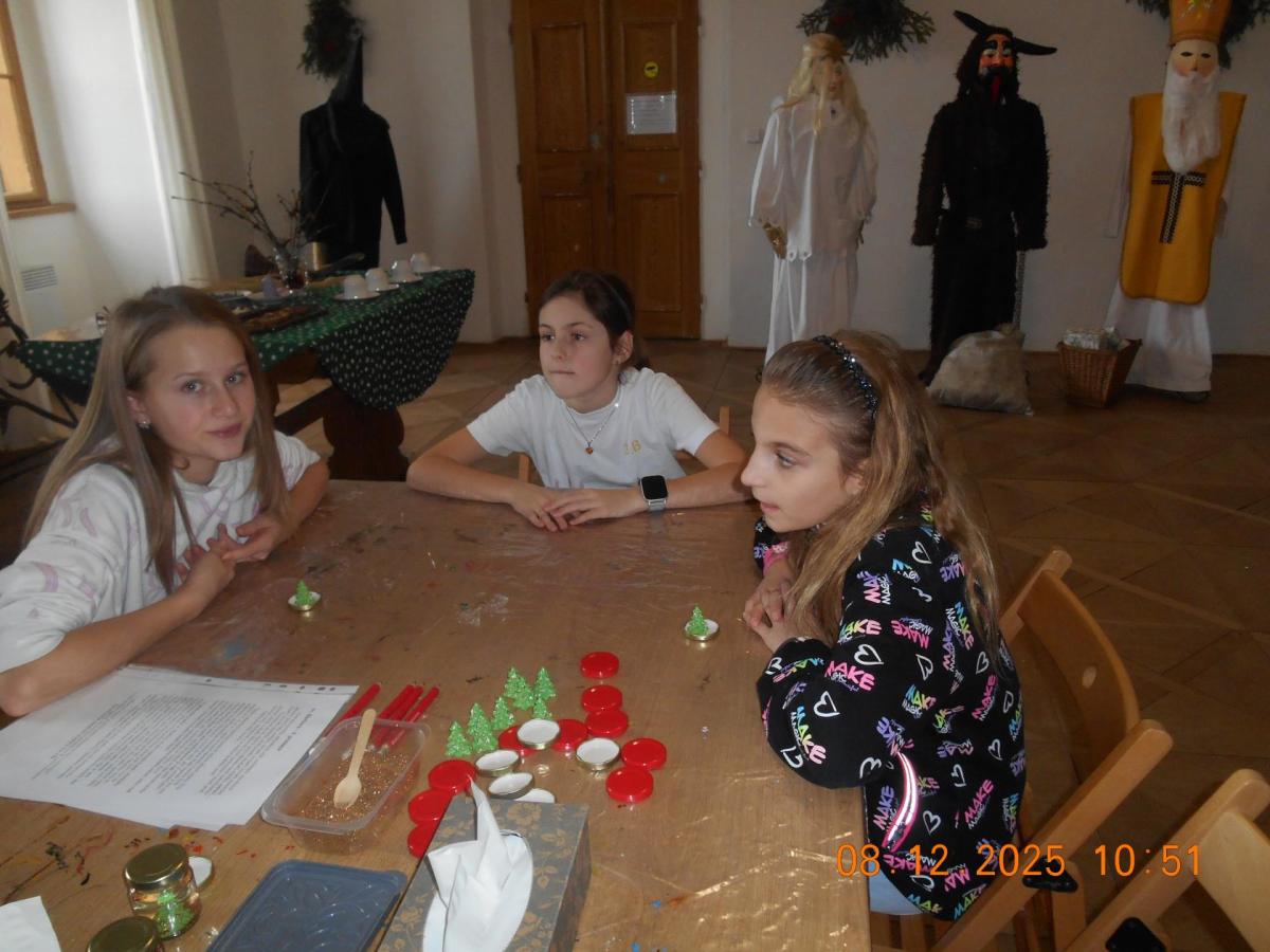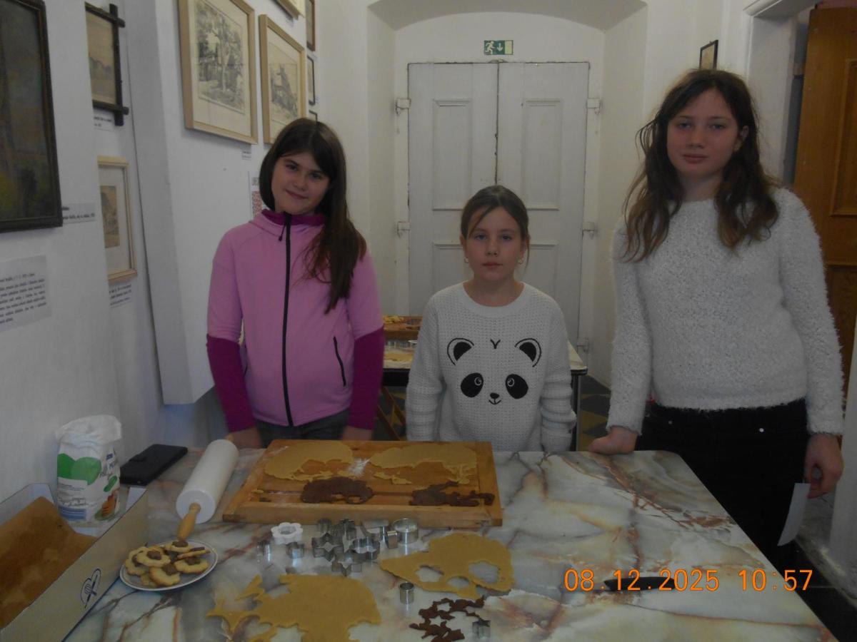 Už ve škole jsme se rozdělili do tří skupin. V muzeu se nás ujaly paní učitelky, ktere se nám na jednotlivých stanovištích velmi trpělivě a ochotně věnovaly. V improvizované " kuchyňce " jsme pekli linecké cukroví. Všichni jsme pečlivě vykrajovali různé tvary cukrovíček. Prostory muzea byly provoněny omamnou vůní a my jsme se těšili, až bude dopečeno. Po vychladnutí jsme konečně mohli naše sladkosti ochutnat. Také jsme se naučili zabalit kostku cukru do hedvábného papíru tak, že vypadala jako opravdový čokoládový bonbon na stromeček. Další místo bylo pro změnu provoněno nádhernou vůní vánočního čaje. Na stolku na nás čekala vánočka. My jsme se způsobně usadili na pohovku a do křesílek, upíjeli jsme čaj a povídali si o tom, jak lidé dříve trávili Vánoce. Celá místnost byla plná krásných vánočních betlémů vyrobených z různých materiálů. V údivu jsme žasli nad zručností a umem našich předků. Také jsme se seznámili s postavou Jiřího Ignáce Linky z Bakova, jehož vánoční hudba navodila nádhernou vánoční atmosféru. V poslední místnosti byly kromě pracovních stolů i postavy ve skutečné velikosti, které jsou spojené s adventem. Každý z nás si vyrobil vánoční " sněžítko " a vyzkoušeli jsme si i některé vánoční zvyky. Advent v muzeu jsme si moc užili a děkujeme všem paním učitelkám, které tento čas trávily s námi. KRÁSNÉ VÁNOCE VŠEM
