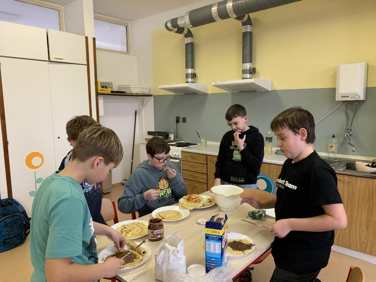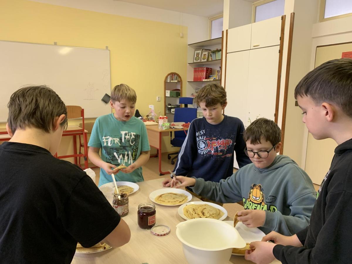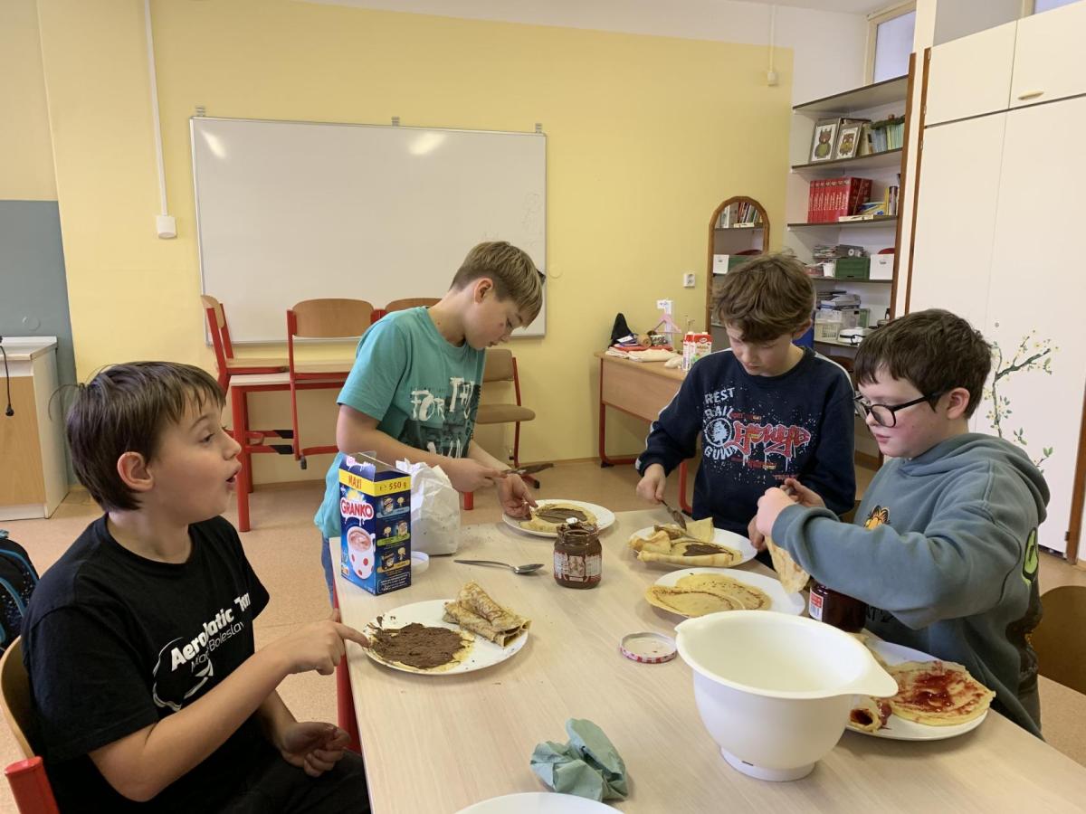 V pátek 16. 1. jsme ve školní kuchyňce zahájili masopustní období opravdu stylově – pečením palačinek.