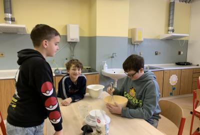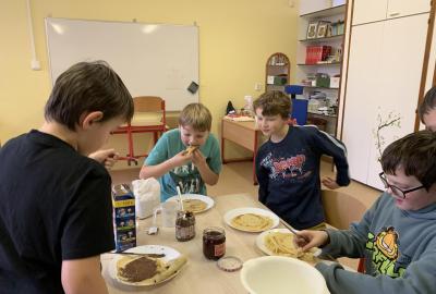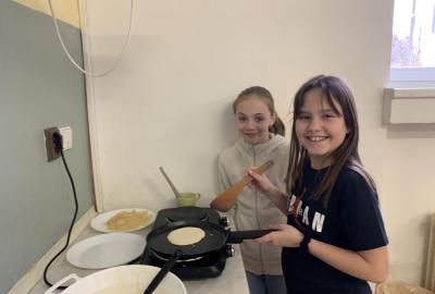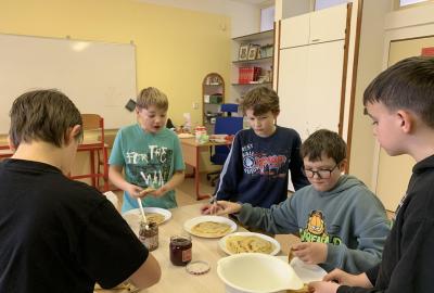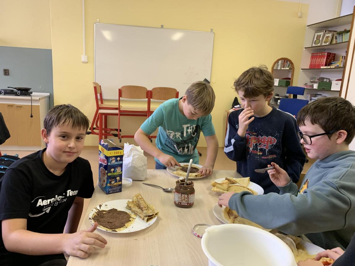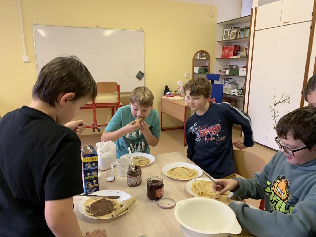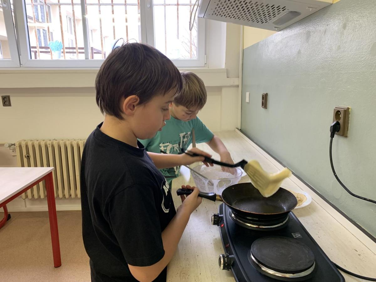 V pátek 16. 1. jsme ve školní kuchyňce zahájili masopustní období opravdu stylově – pečením palačinek.