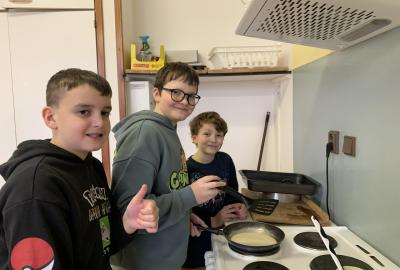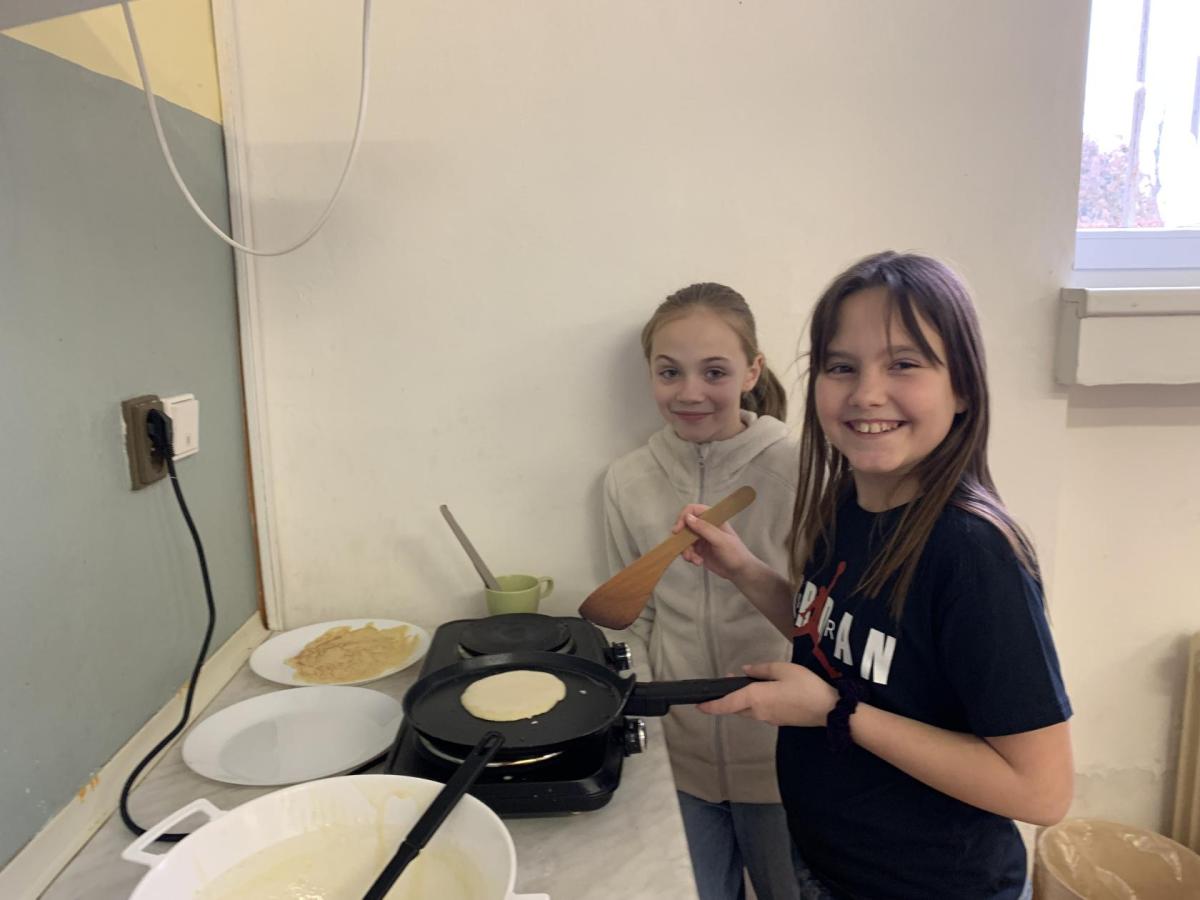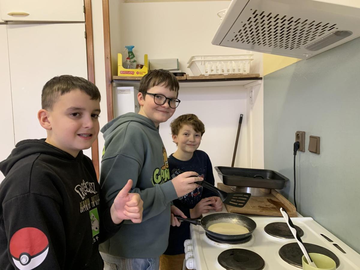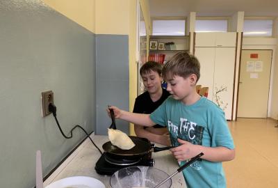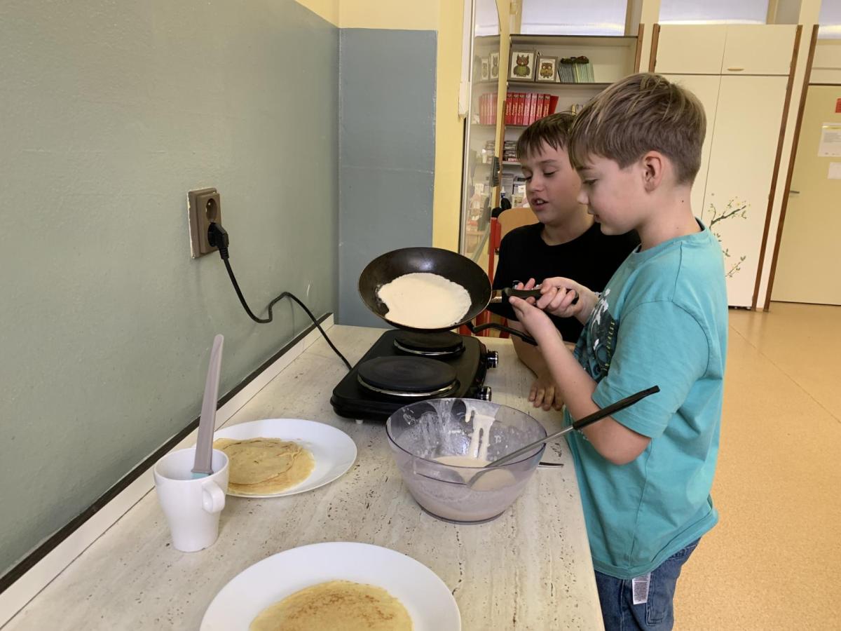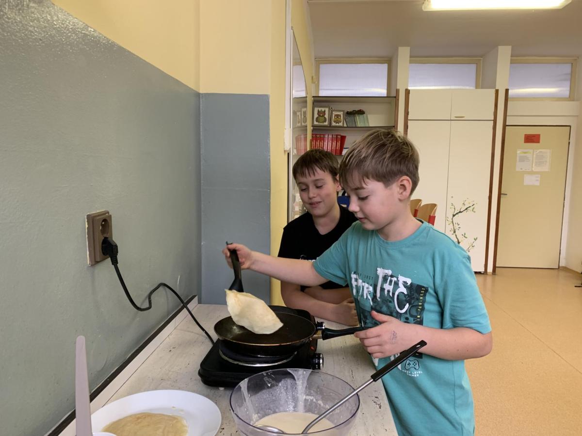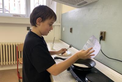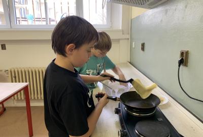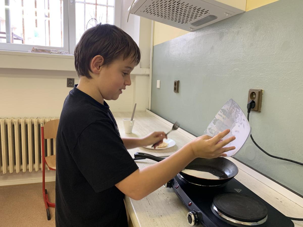 Děti se s nadšením pustily do příprav – vážily mouku, zkoumaly kuchyňskou váhu a společně vykouzlily palačinkové těsto. A pak začalo to pravé palačinkové dobrodružství! Ukázala jsem jim, jak palačinky správně opékat, obracet a hlavně nadhazovat ve vzduchu. Každý hod byl malým adrenalinovým okamžikem – kuchyňkou se linulo povzbuzování, smích i radostné výkřiky, když palačinka bezpečně přistála zpátky na pánvi. Některé děti se brzy proměnily v opravdové mistry palačinkových obratů!