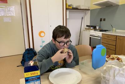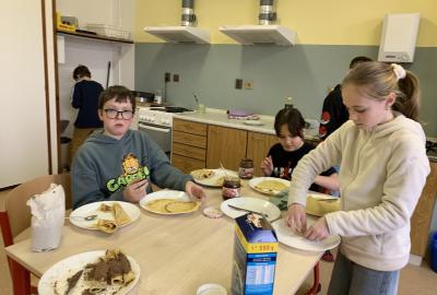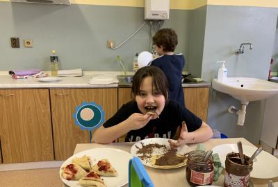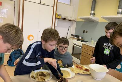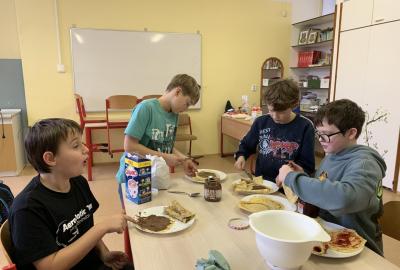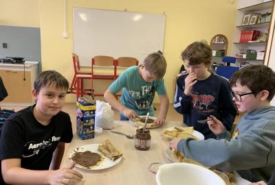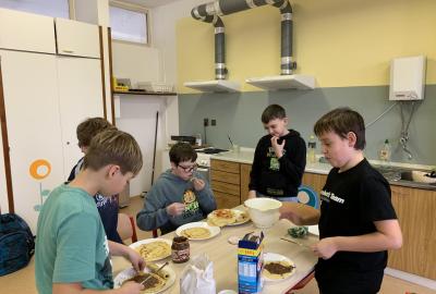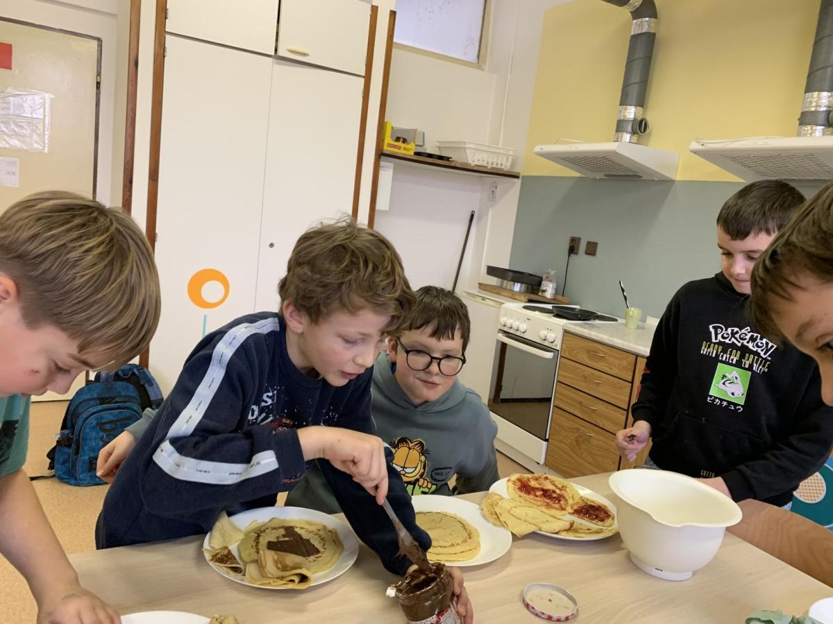Když bylo hotovo, přišla sladká odměna. Palačinky jsme mazali nutellou, jahodovou marmeládou a sypali grankem. Mizely závratnou rychlostí – každý si s chutí pochutnal na 3–4 kouscích. Některé děti si jednu palačinku odnesly i domů, aby se o svůj kuchařský úspěch mohly podělit s rodiči.