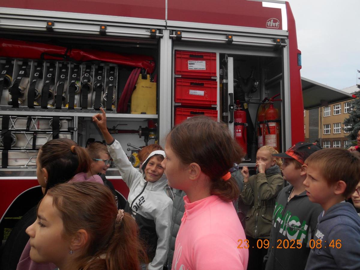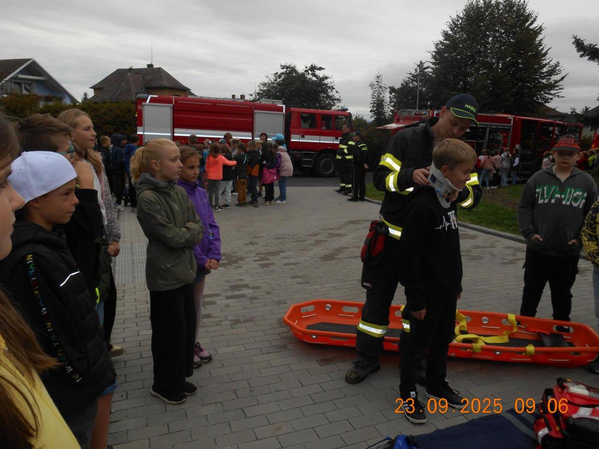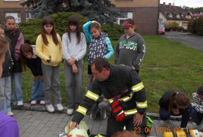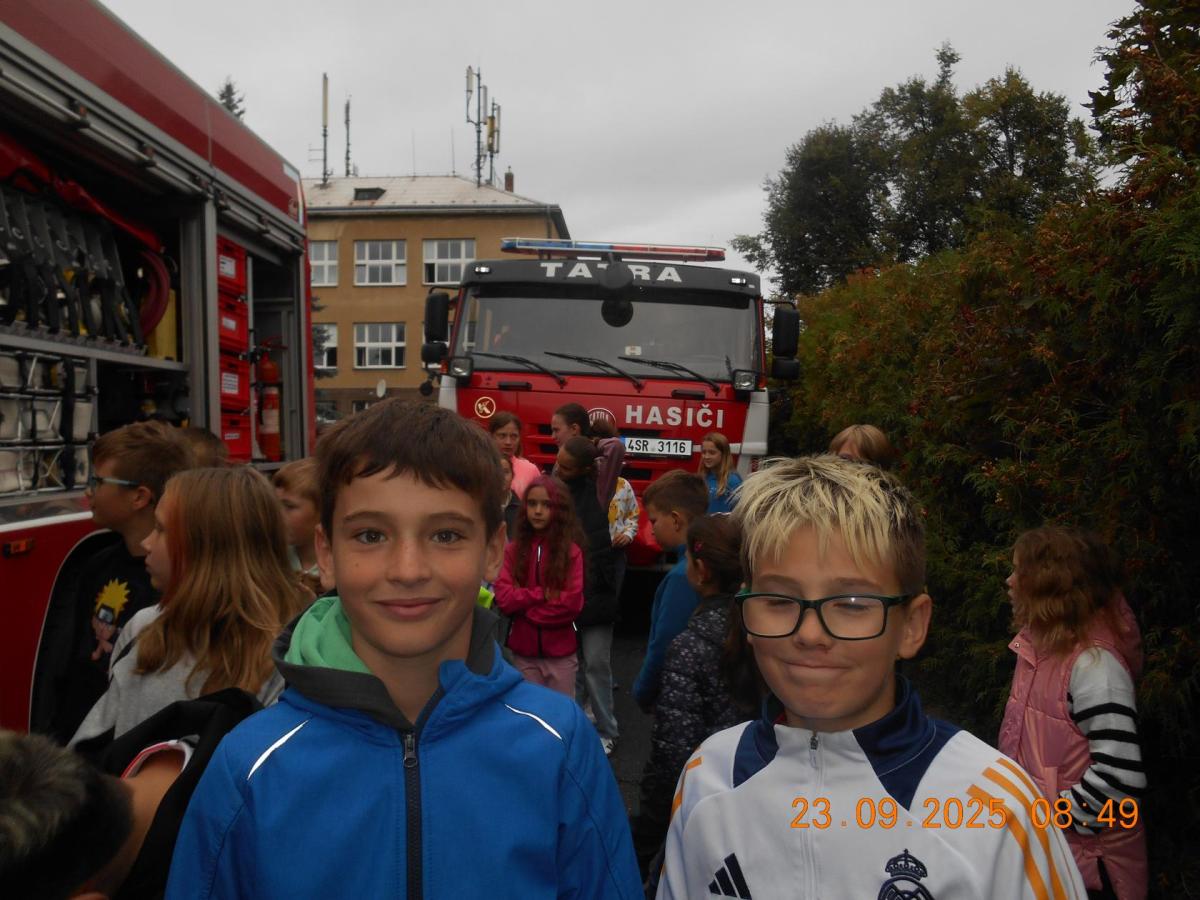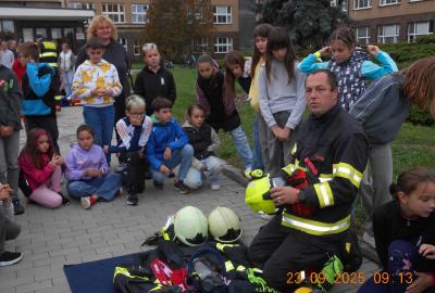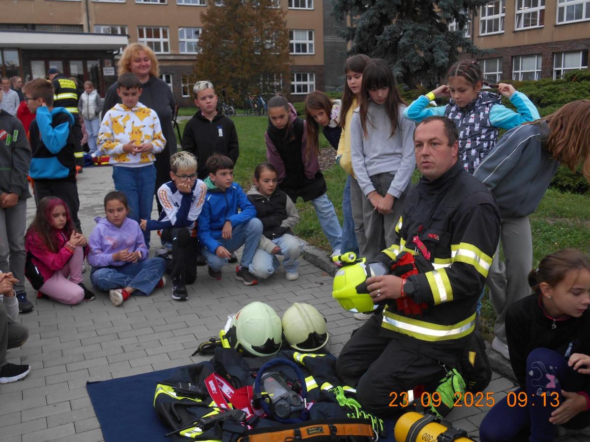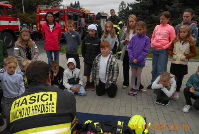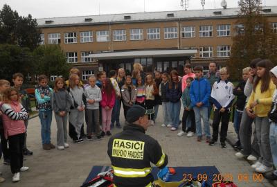 Během několika minut jsme všichni spořádaně opustili naše učebny a shromáždili se před školou. Hasiči zkontrolovali přesný počet žáků i zaměstnanců školy. Vše bylo rychlé a stav žactva souhlasil. Druhý stupeň se poté vrátil k výuce, ale 4. a 5. ročníky před školou zůstaly. Byla pro nás připravena tři stanoviště. Na každém z nich jsme se dozvěděli spoustu zajímavostí týkajících se nejen náplně práce hasičů, ale i jakou mají technickou vybavenost, co musí mít na sobě při zásahu, ... Uvědomili jsme si, že hasiči jsou pro nás všechny důležití nejen při hašení požárů, ale i při dopravních nehodách, při záplavách - zkrátka ve všech oblastech našeho bytí zachraňují naše životy i náš majetek, za což jim všem DĚKUJEME.