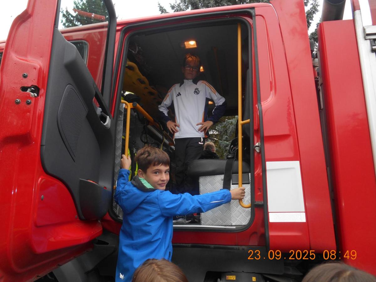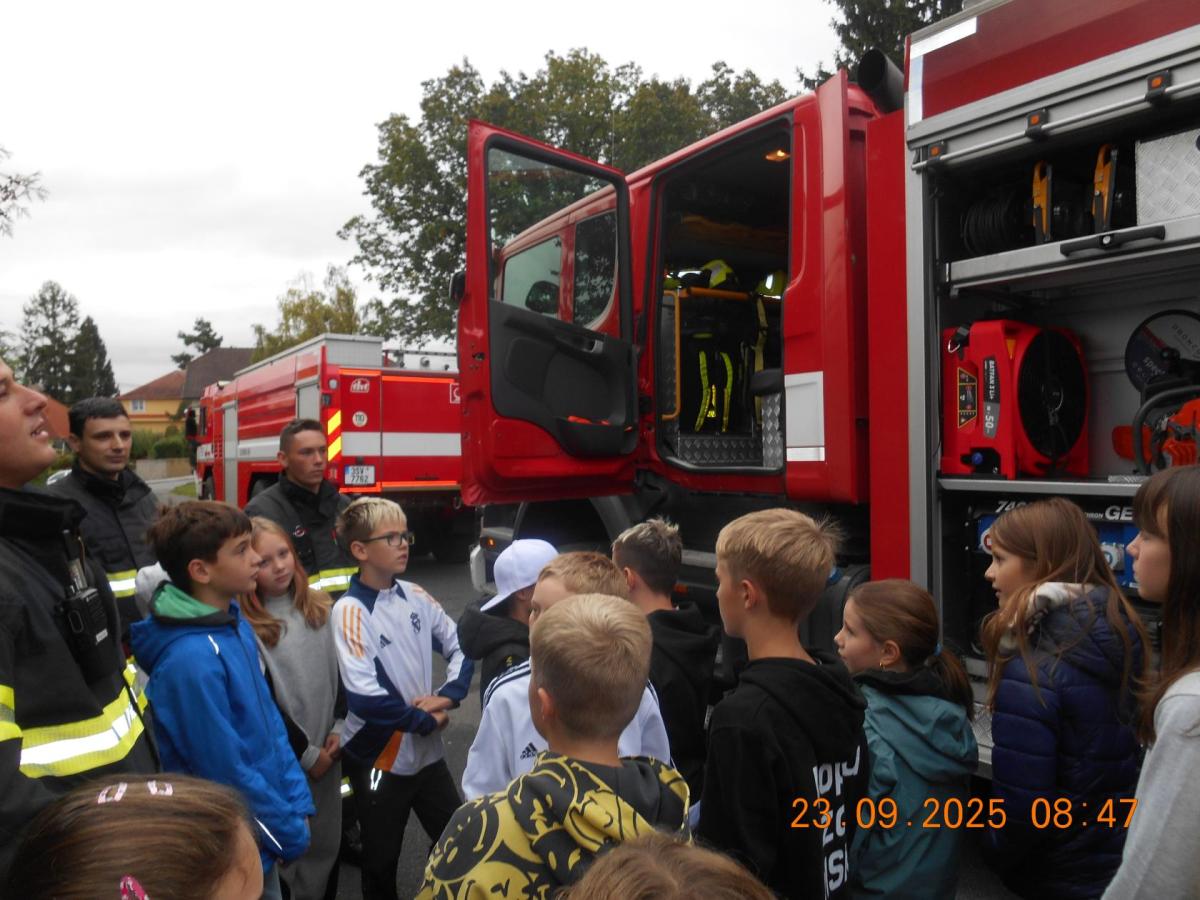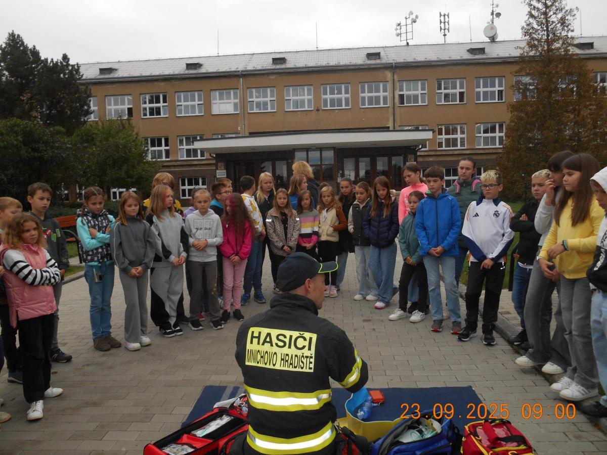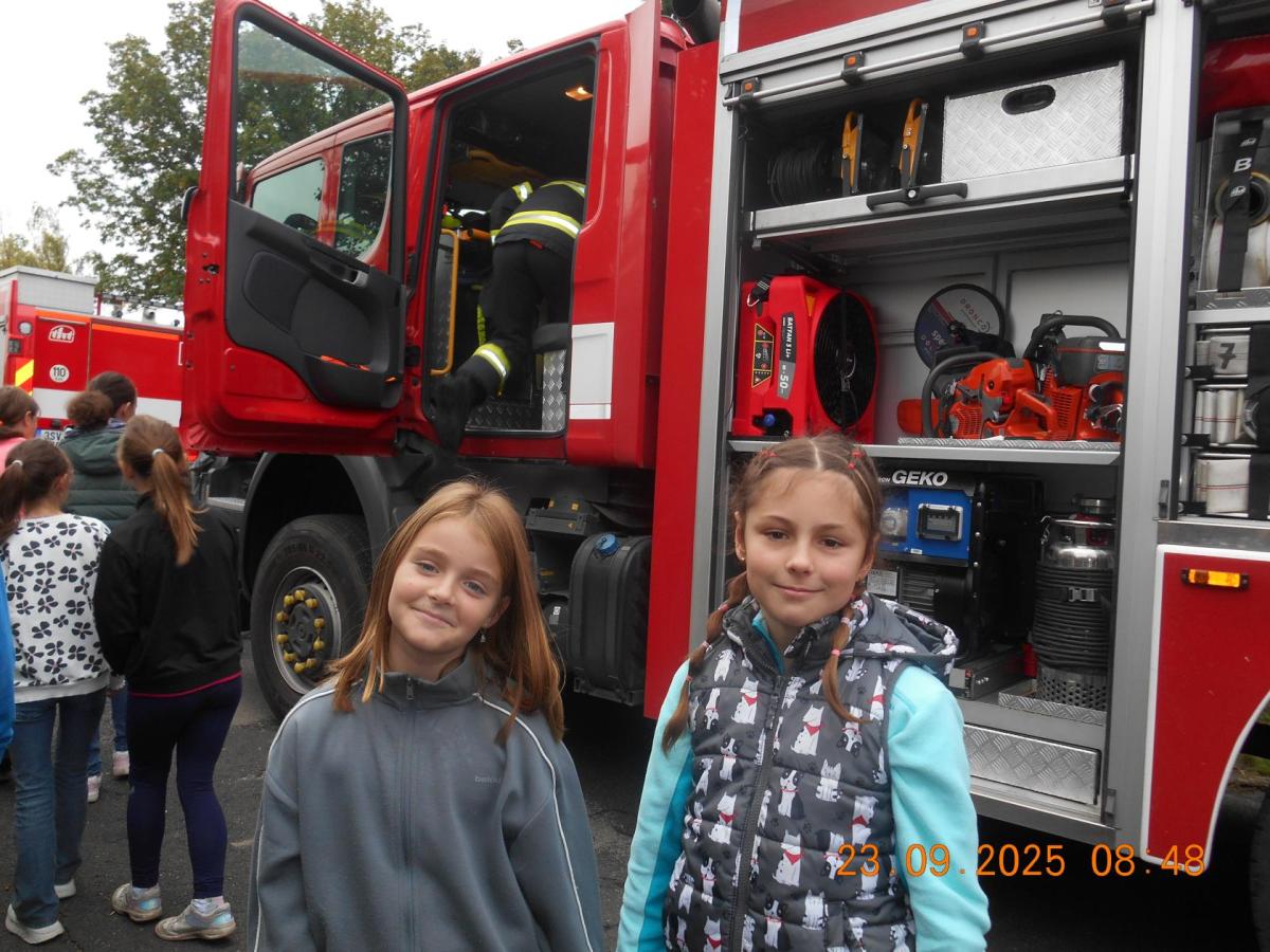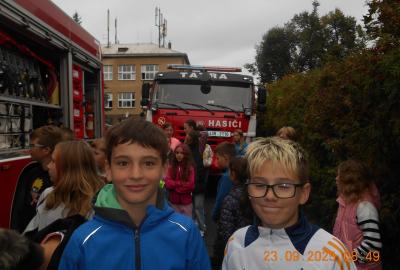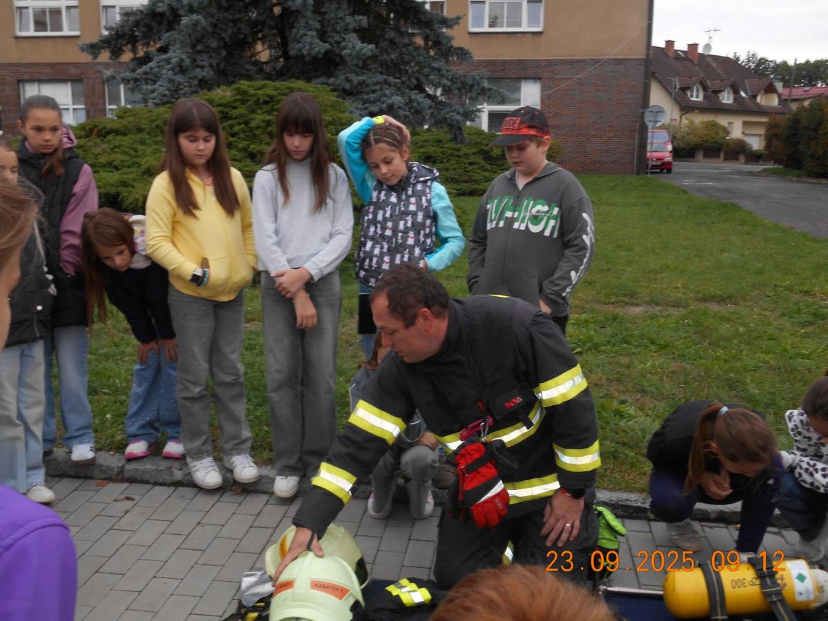 Během několika minut jsme všichni spořádaně opustili naše učebny a shromáždili se před školou. Hasiči zkontrolovali přesný počet žáků i zaměstnanců školy. Vše bylo rychlé a stav žactva souhlasil. Druhý stupeň se poté vrátil k výuce, ale 4. a 5. ročníky před školou zůstaly. Byla pro nás připravena tři stanoviště. Na každém z nich jsme se dozvěděli spoustu zajímavostí týkajících se nejen náplně práce hasičů, ale i jakou mají technickou vybavenost, co musí mít na sobě při zásahu, ... Uvědomili jsme si, že hasiči jsou pro nás všechny důležití nejen při hašení požárů, ale i při dopravních nehodách, při záplavách - zkrátka ve všech oblastech našeho bytí zachraňují naše životy i náš majetek, za což jim všem DĚKUJEME.