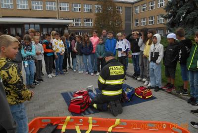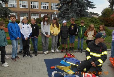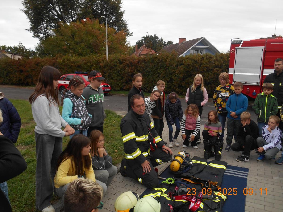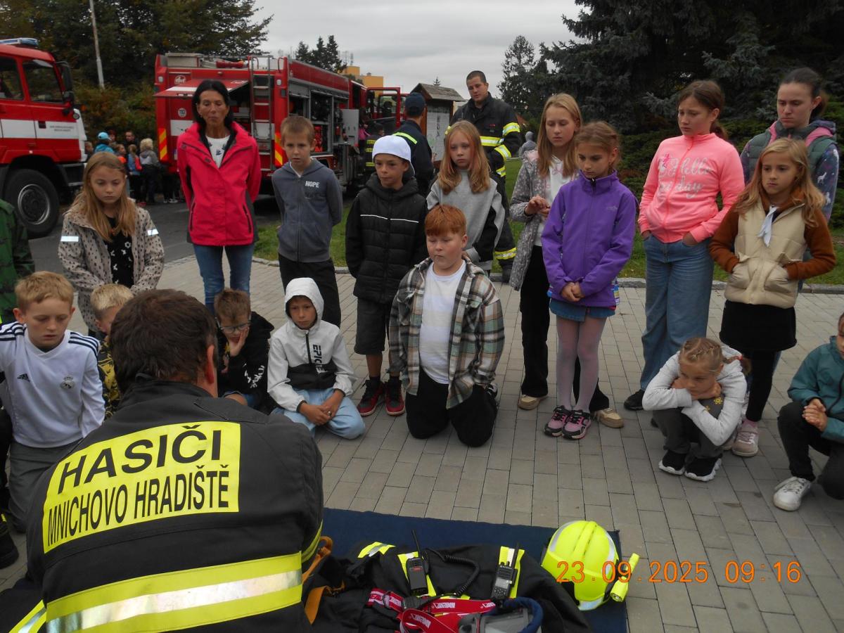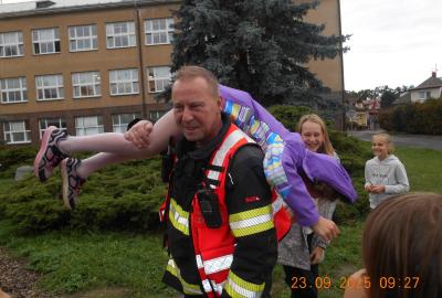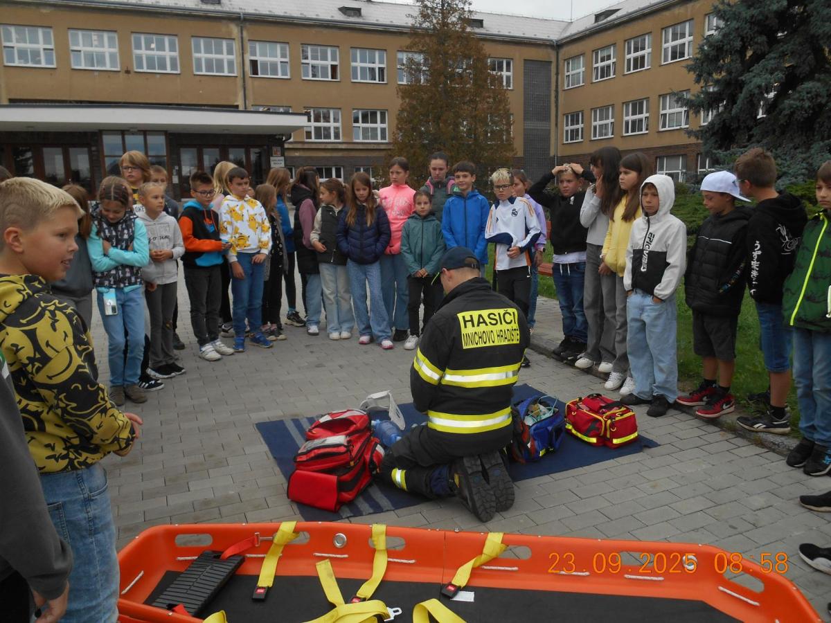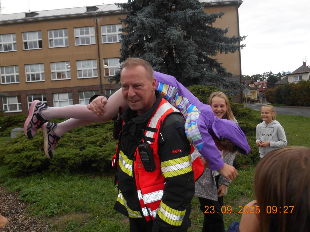 Během několika minut jsme všichni spořádaně opustili naše učebny a shromáždili se před školou. Hasiči zkontrolovali přesný počet žáků i zaměstnanců školy. Vše bylo rychlé a stav žactva souhlasil. Druhý stupeň se poté vrátil k výuce, ale 4. a 5. ročníky před školou zůstaly. Byla pro nás připravena tři stanoviště. Na každém z nich jsme se dozvěděli spoustu zajímavostí týkajících se nejen náplně práce hasičů, ale i jakou mají technickou vybavenost, co musí mít na sobě při zásahu, ... Uvědomili jsme si, že hasiči jsou pro nás všechny důležití nejen při hašení požárů, ale i při dopravních nehodách, při záplavách - zkrátka ve všech oblastech našeho bytí zachraňují naše životy i náš majetek, za což jim všem DĚKUJEME.