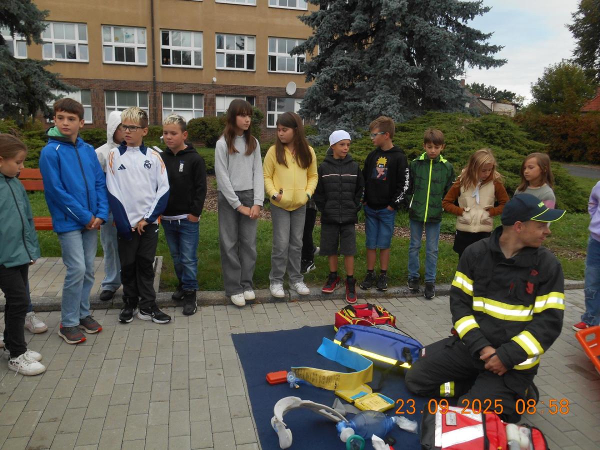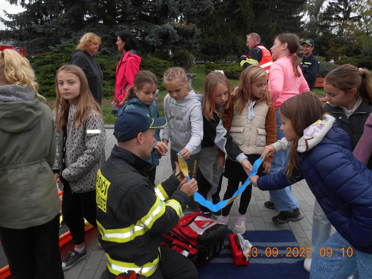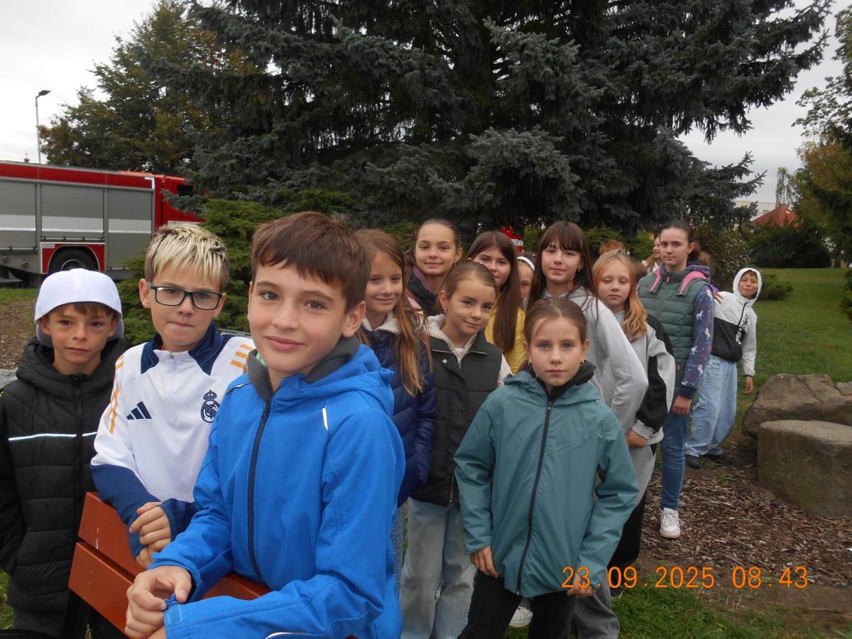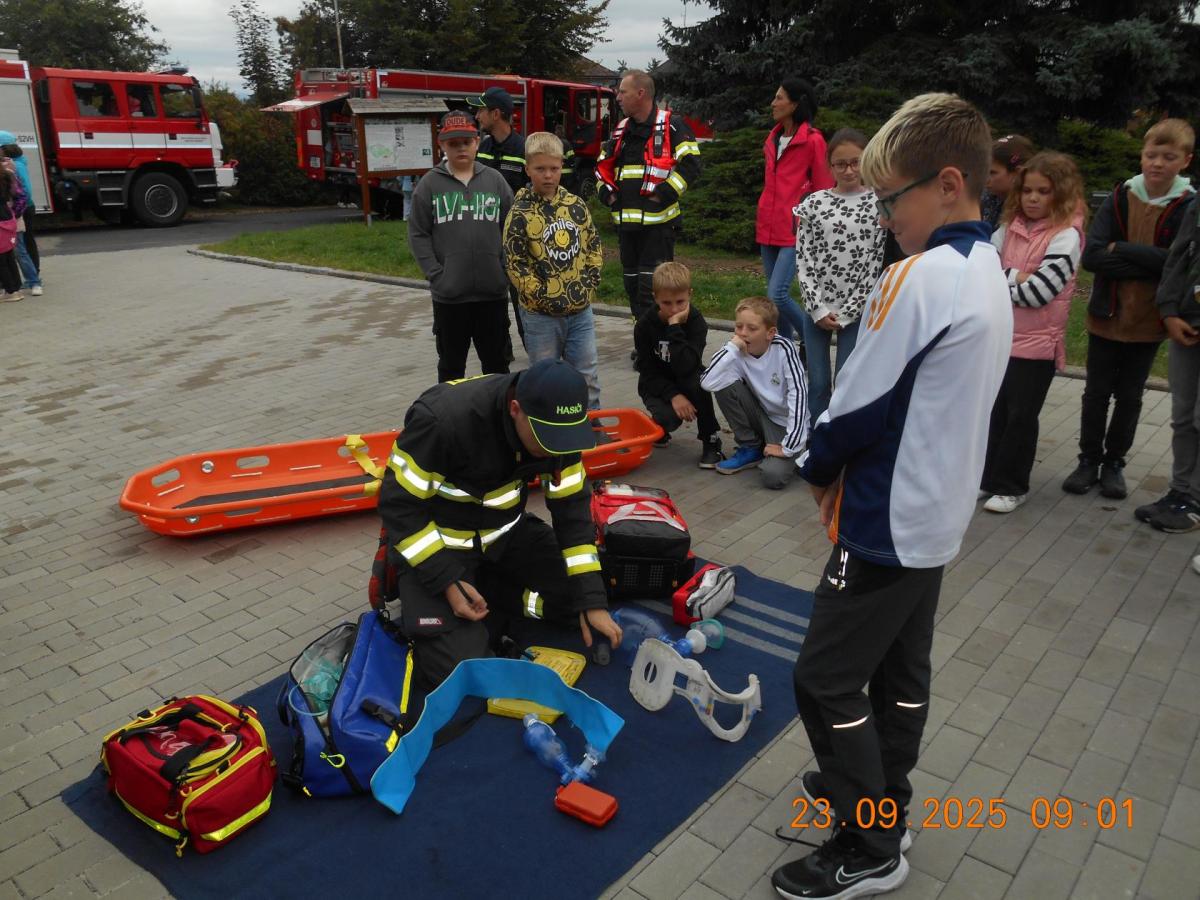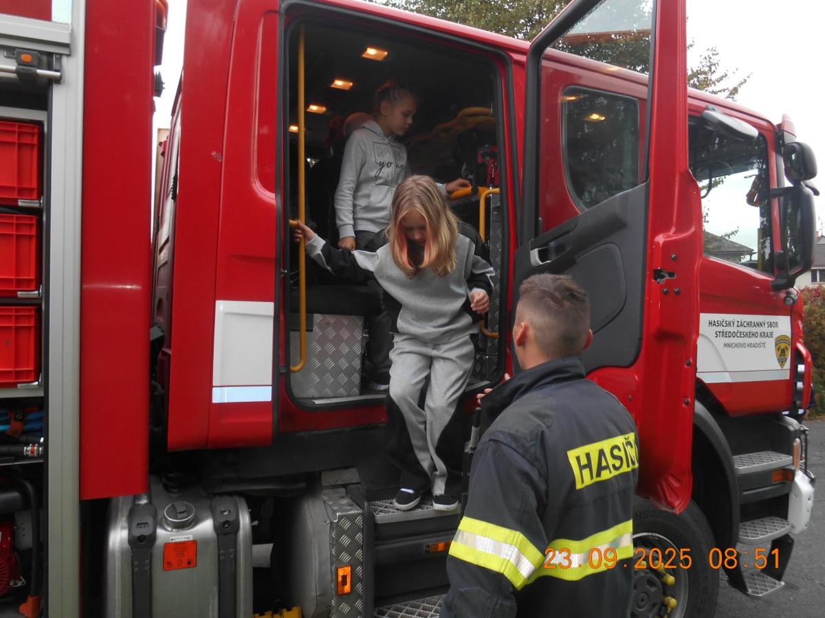 Během několika minut jsme všichni spořádaně opustili naše učebny a shromáždili se před školou. Hasiči zkontrolovali přesný počet žáků i zaměstnanců školy. Vše bylo rychlé a stav žactva souhlasil. Druhý stupeň se poté vrátil k výuce, ale 4. a 5. ročníky před školou zůstaly. Byla pro nás připravena tři stanoviště. Na každém z nich jsme se dozvěděli spoustu zajímavostí týkajících se nejen náplně práce hasičů, ale i jakou mají technickou vybavenost, co musí mít na sobě při zásahu, ... Uvědomili jsme si, že hasiči jsou pro nás všechny důležití nejen při hašení požárů, ale i při dopravních nehodách, při záplavách - zkrátka ve všech oblastech našeho bytí zachraňují naše životy i náš majetek, za což jim všem DĚKUJEME.