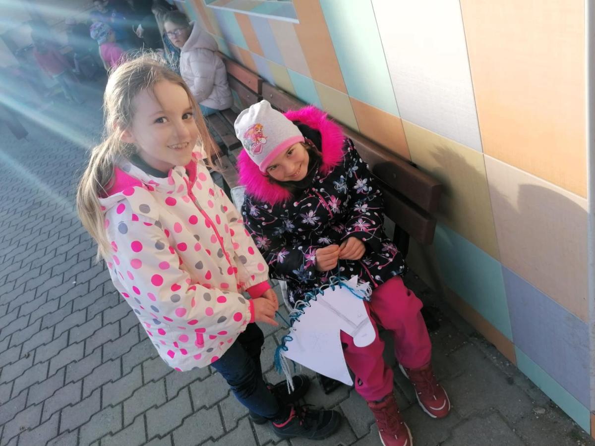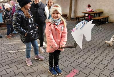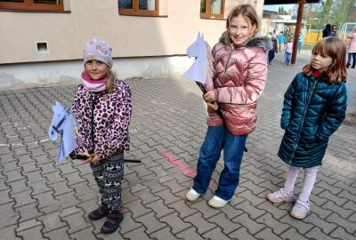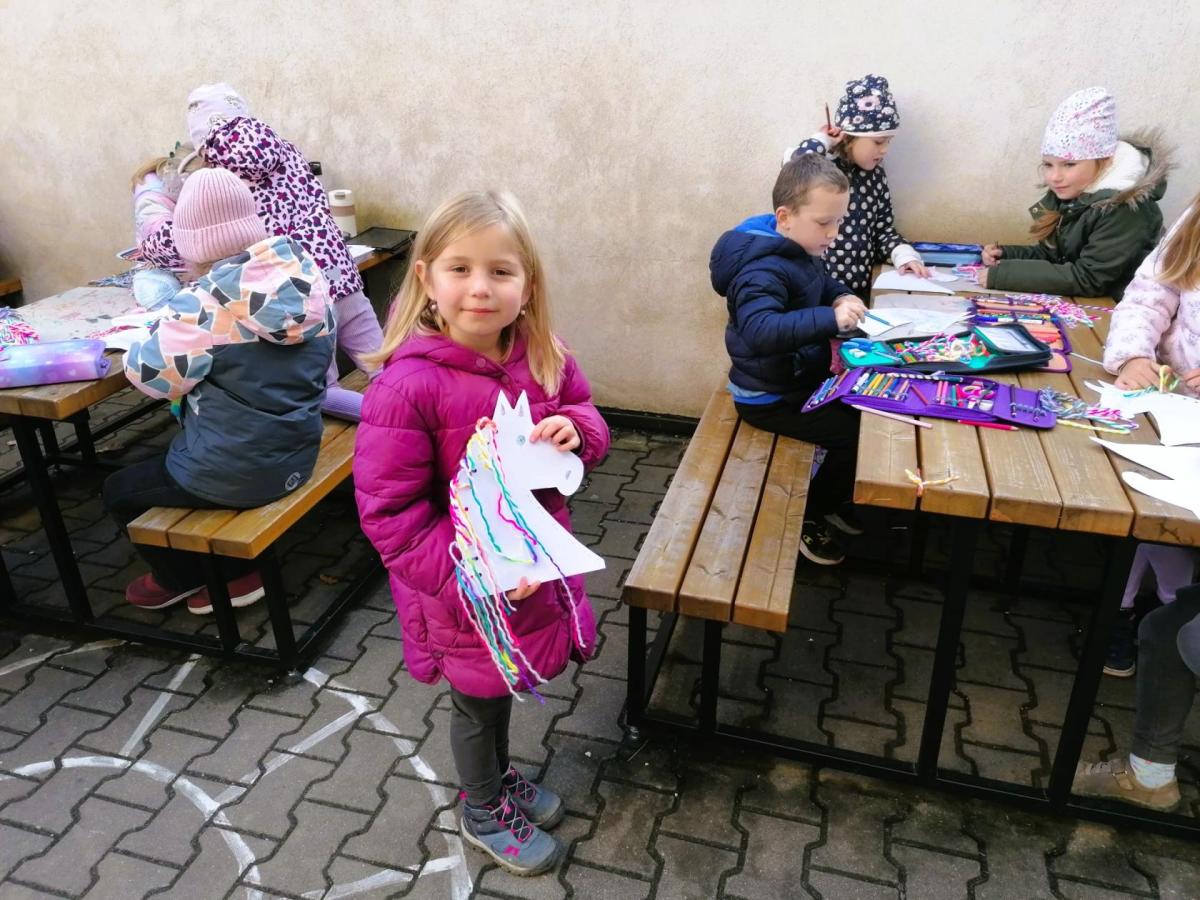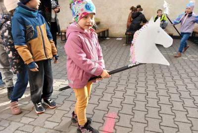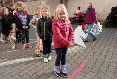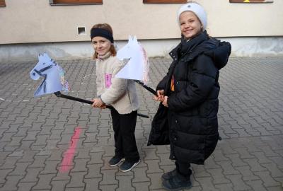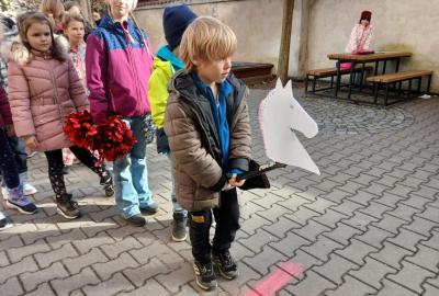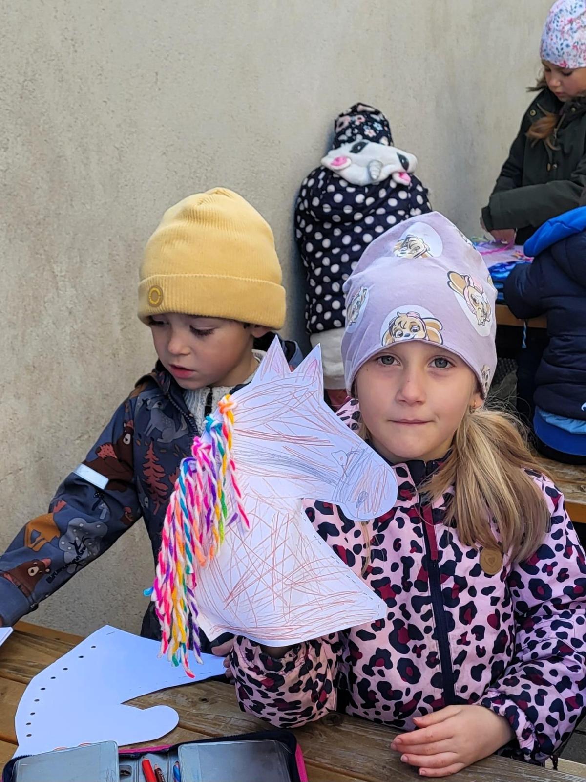 Kdo chtěl, vyrobil si koňskou hlavu – nejdříve obkreslily a vystřihly šablonu, pak ji vyzdobily podle vlastní fantazie. Některé koně měly hřívu z vlny, jiné z krepového papíru. Když byly všechny hlavy hotové, děti je připevnily na tyčku a vydali jsme se na další část programu.