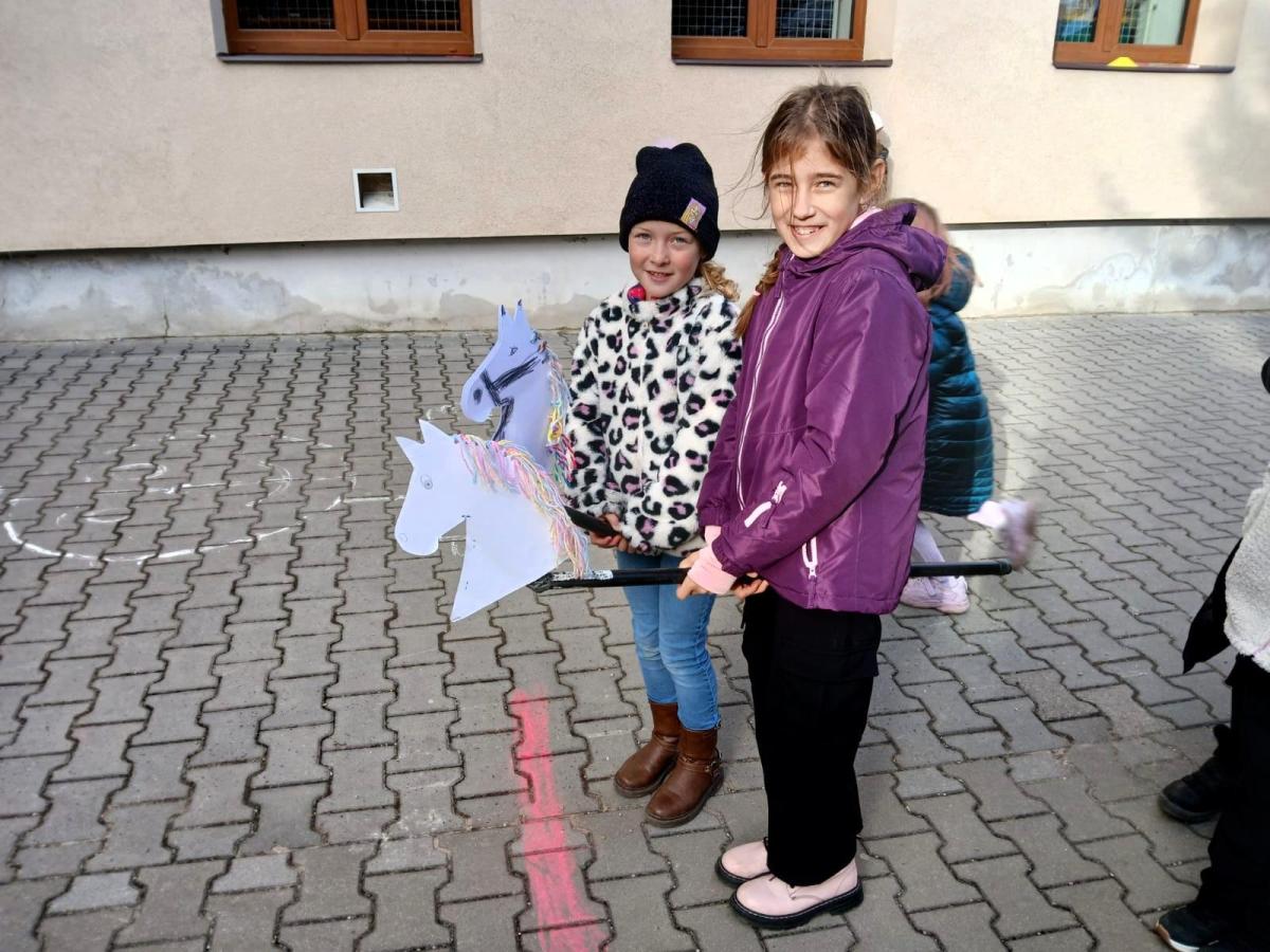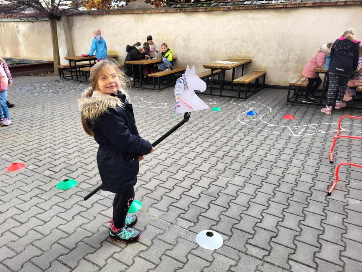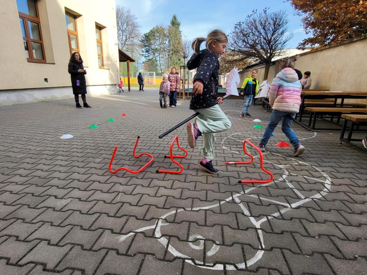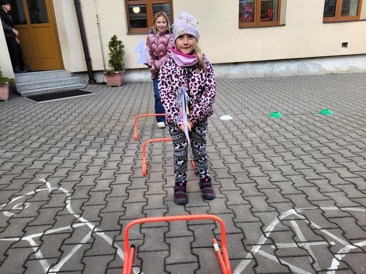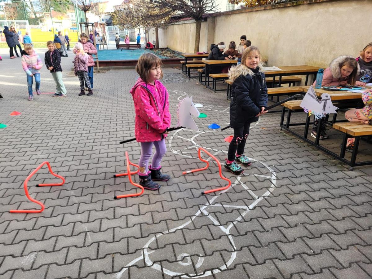 Na školním hřišti jsme připravili překážkovou dráhu, kterou děti projížděly jako opravdoví jezdci. Přeskakovaly malé překážky, projížděly slalomem, musely se vyhnout „zimní vánici“. Všichni si to náramně užili – nechyběl smích, fandění ani radost z pohybu.