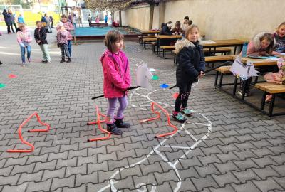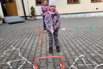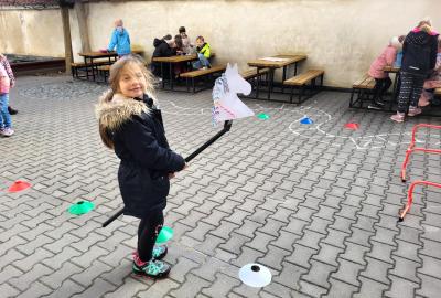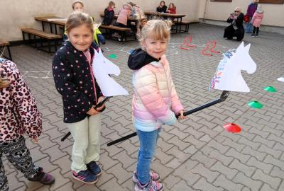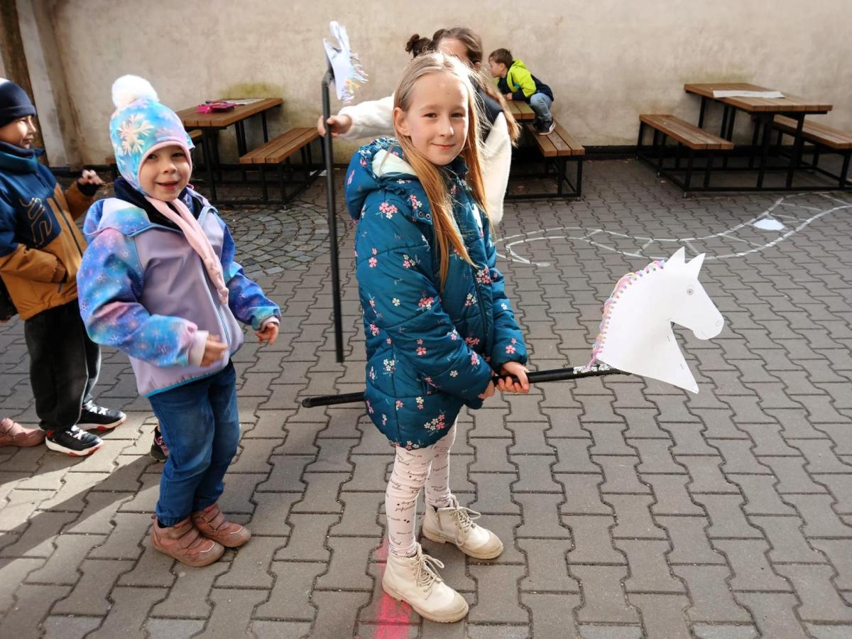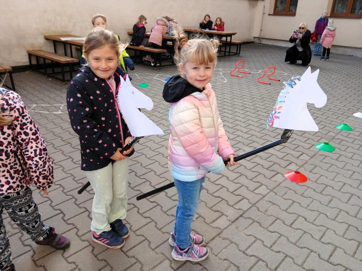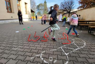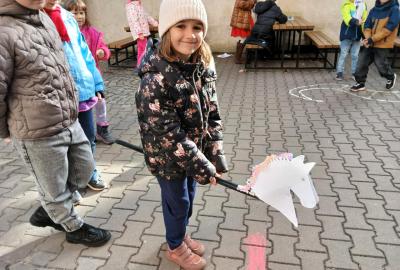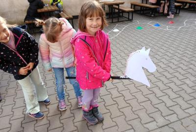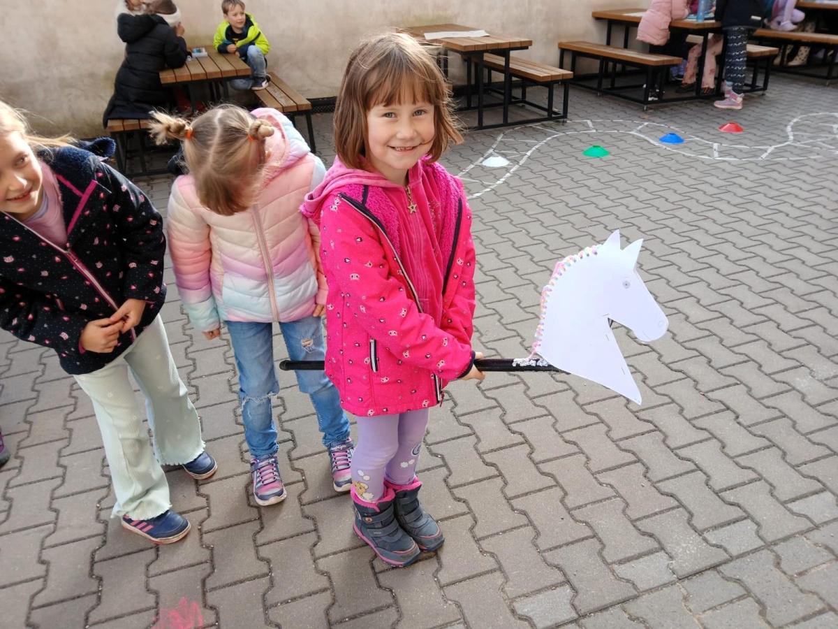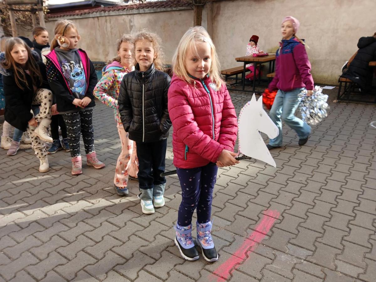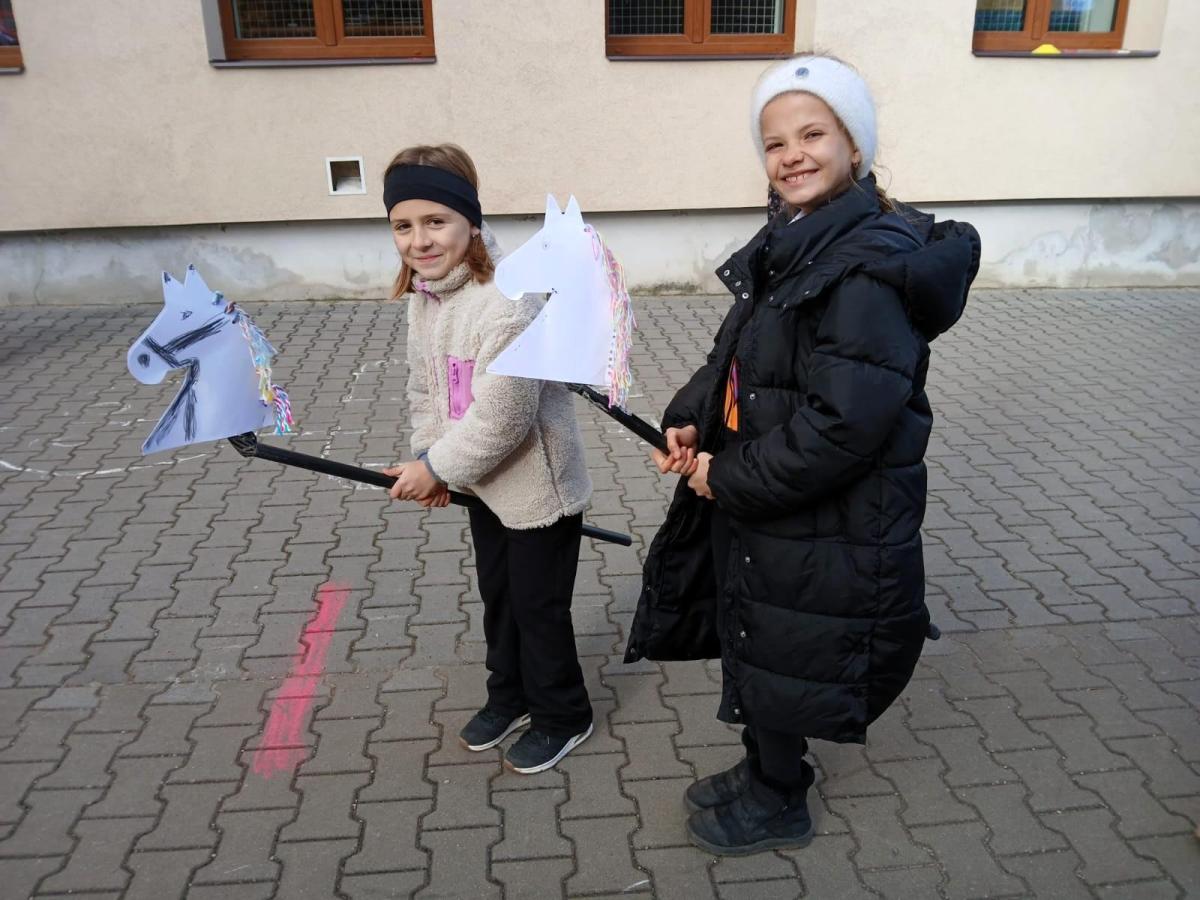 Na školním hřišti jsme připravili překážkovou dráhu, kterou děti projížděly jako opravdoví jezdci. Přeskakovaly malé překážky, projížděly slalomem, musely se vyhnout „zimní vánici“. Všichni si to náramně užili – nechyběl smích, fandění ani radost z pohybu.