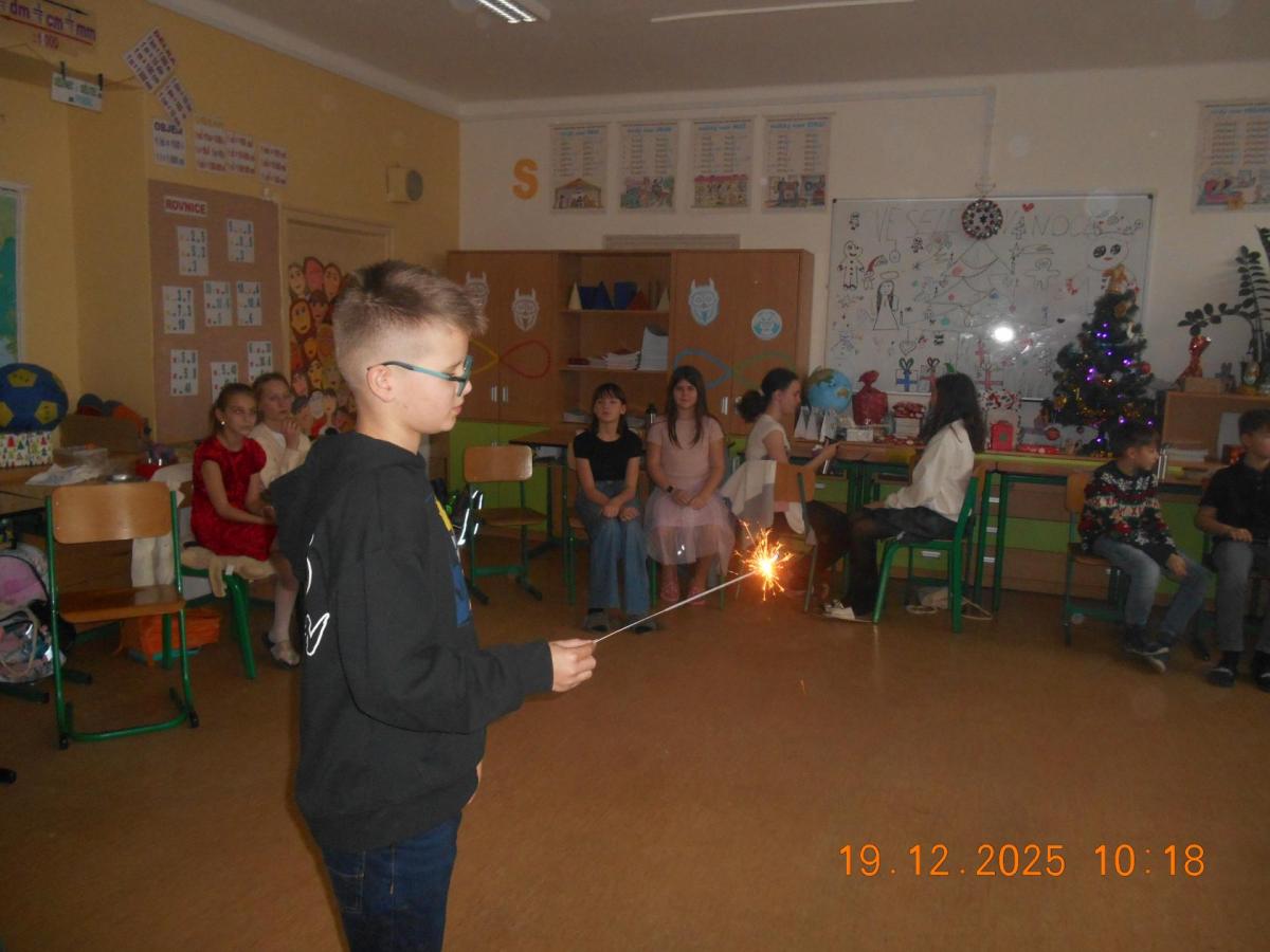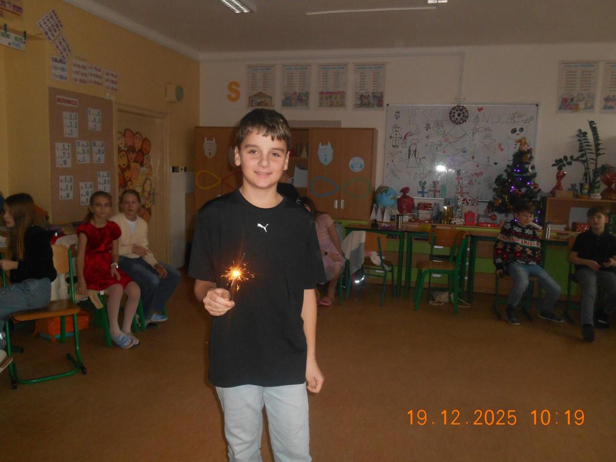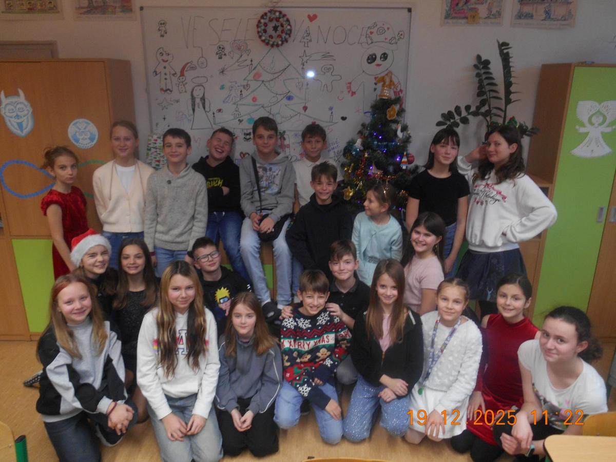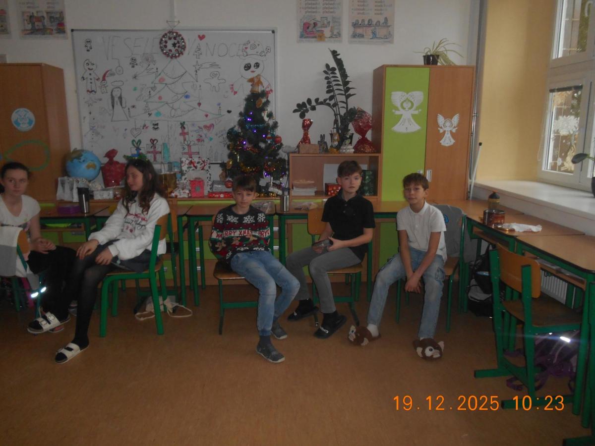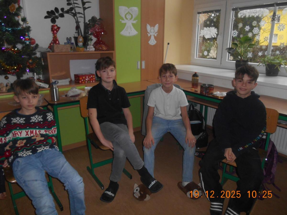 Poslední den roku 2025 ve škole vyšel na pátek 19. 12. Všichni jsme se na tento den nesmírně těšili a řádně se na něj připravili. Přinesli jsme si hrníčky na čaj, cukroví a pochopitelně i dárky pro své kamarády. Besídka proběhla ve veselé vánoční náladě. Nakonec jsme si navzájem si popřáli krásné a pohodové Vánoce. S radostí jsme se rozběhli do svých domovů, kde nás zajisté čekají další krásná překvapení.