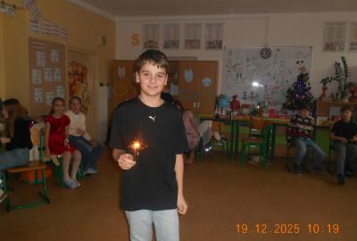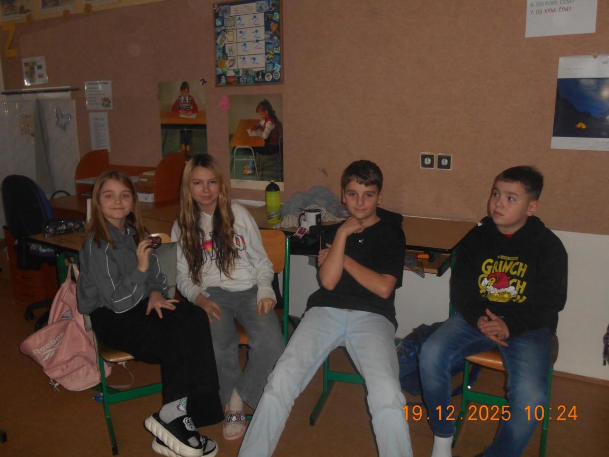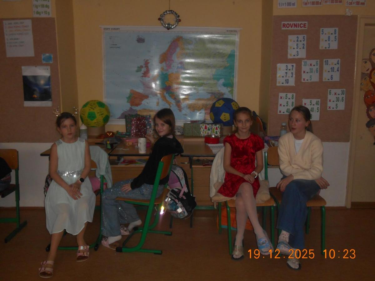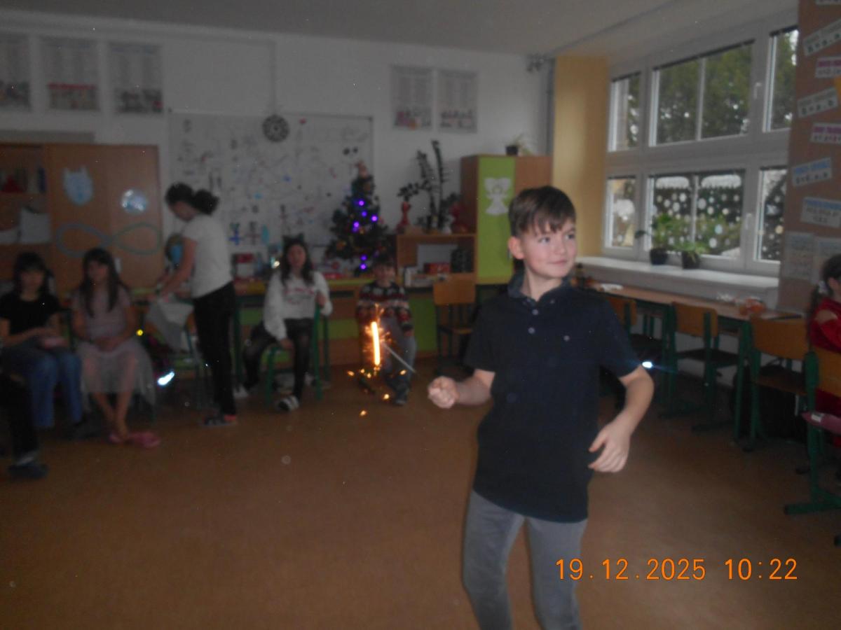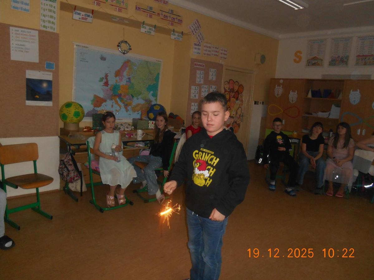 Poslední den roku 2025 ve škole vyšel na pátek 19. 12. Všichni jsme se na tento den nesmírně těšili a řádně se na něj připravili. Přinesli jsme si hrníčky na čaj, cukroví a pochopitelně i dárky pro své kamarády. Besídka proběhla ve veselé vánoční náladě. Nakonec jsme si navzájem si popřáli krásné a pohodové Vánoce. S radostí jsme se rozběhli do svých domovů, kde nás zajisté čekají další krásná překvapení.