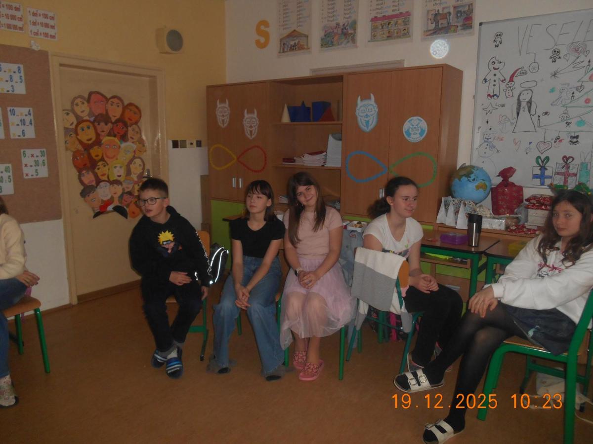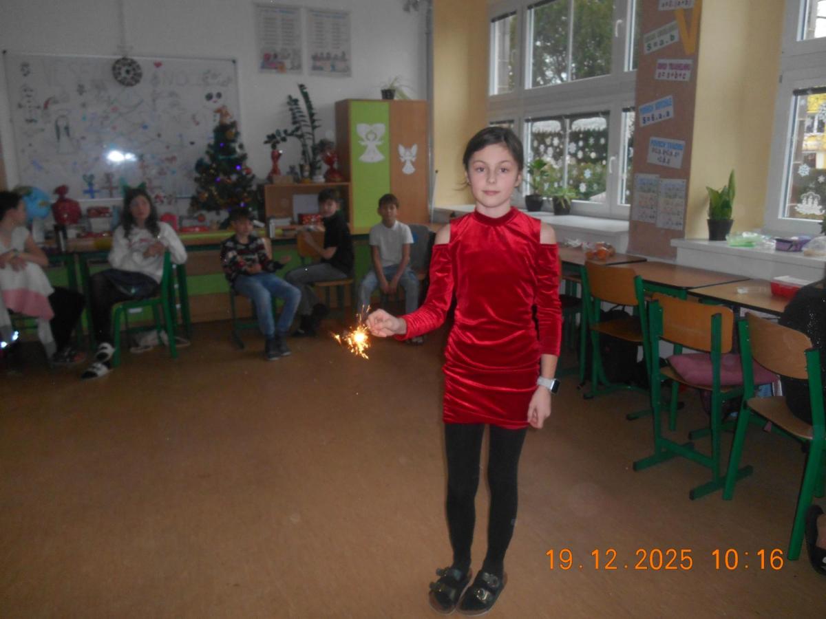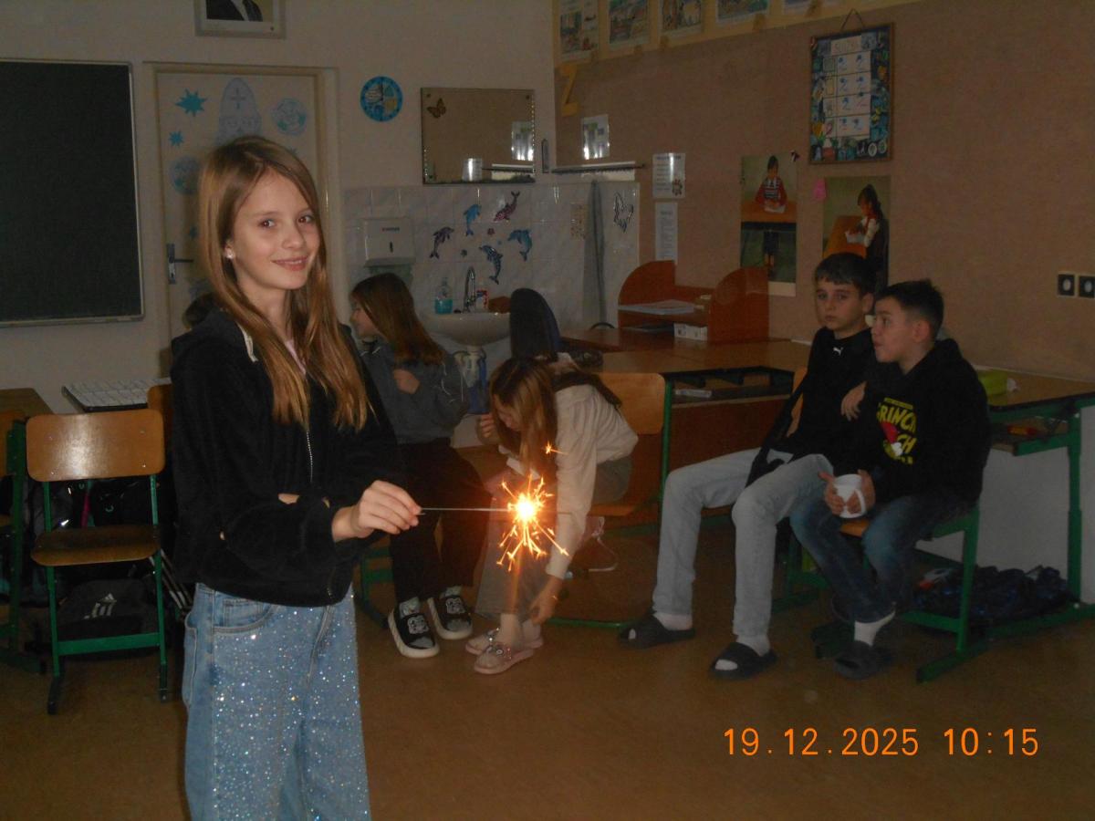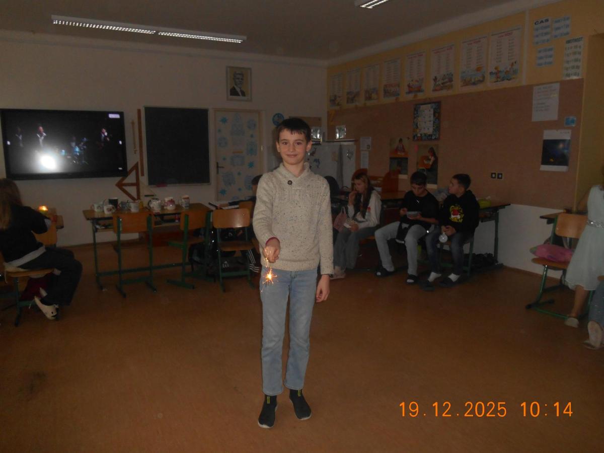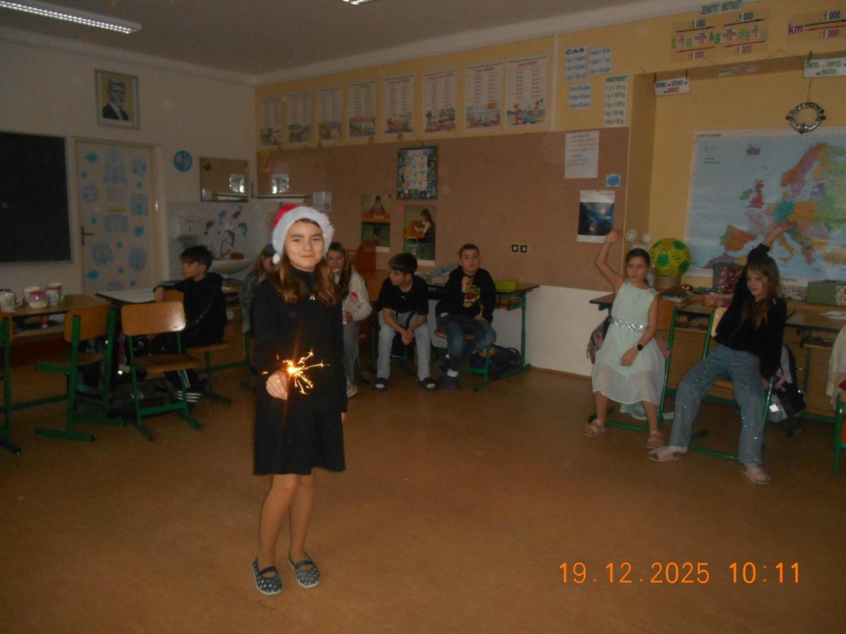 Poslední den roku 2025 ve škole vyšel na pátek 19. 12. Všichni jsme se na tento den nesmírně těšili a řádně se na něj připravili. Přinesli jsme si hrníčky na čaj, cukroví a pochopitelně i dárky pro své kamarády. Besídka proběhla ve veselé vánoční náladě. Nakonec jsme si navzájem si popřáli krásné a pohodové Vánoce. S radostí jsme se rozběhli do svých domovů, kde nás zajisté čekají další krásná překvapení.